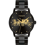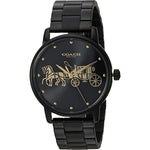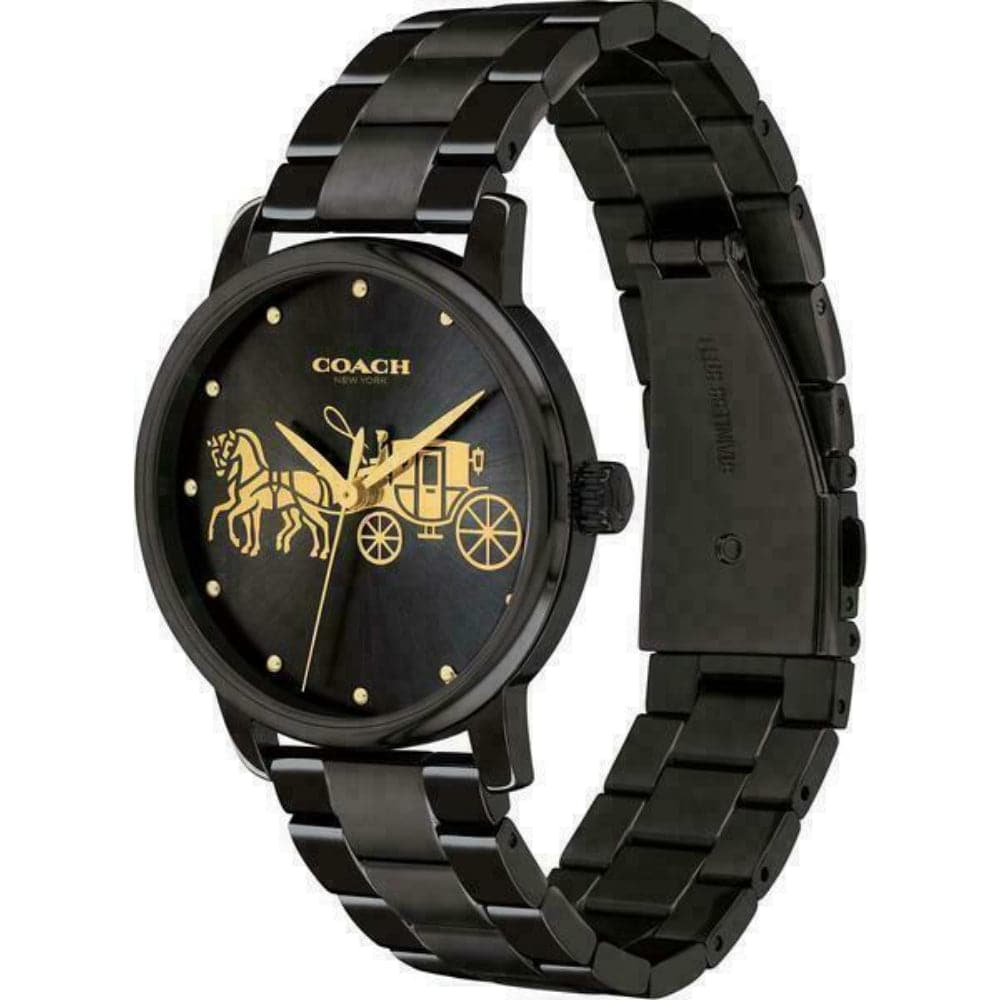 This ladies Coach Grand watch has a black ion-plated steel black ion-plated steel case and is powered by a quartz movement. It is fitted with a black metal bracelet and has a black dial.
