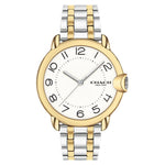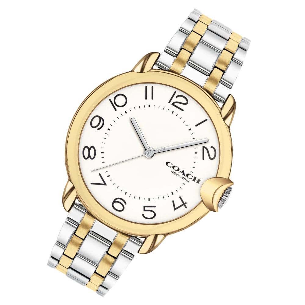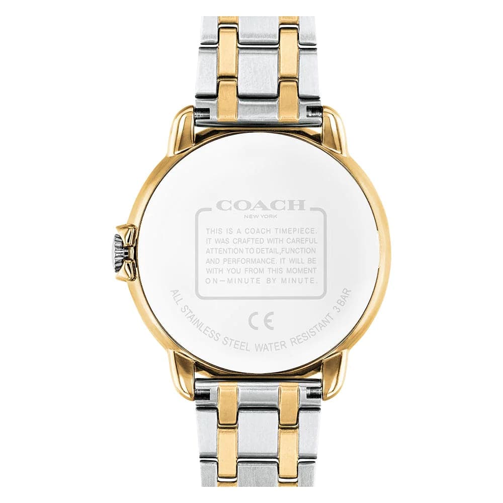Bring classic elegance to your wardrobe with the Coach Arden Two-Tone Steel Women's Watch! This timeless piece showcases classic quartz movement within a 36 mm case with a two-tone stainless steel strap. It also boasts an ionic thin gold plated stainless steel case, and mineral crystal, and has a water resistance of up to 3 ATM. Make a statement with this stunning watch!