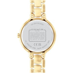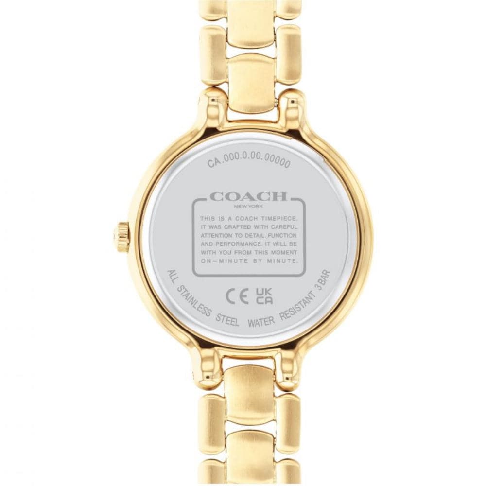 Ladies Coach watch from the Chelsea family. Featuring a 32mm round gold IP case, gold sunray dial and crystal set bezel. Finished on a 3 link carnation gold IP bracelet. Water resistant to 3ATM.