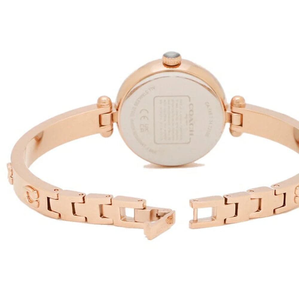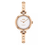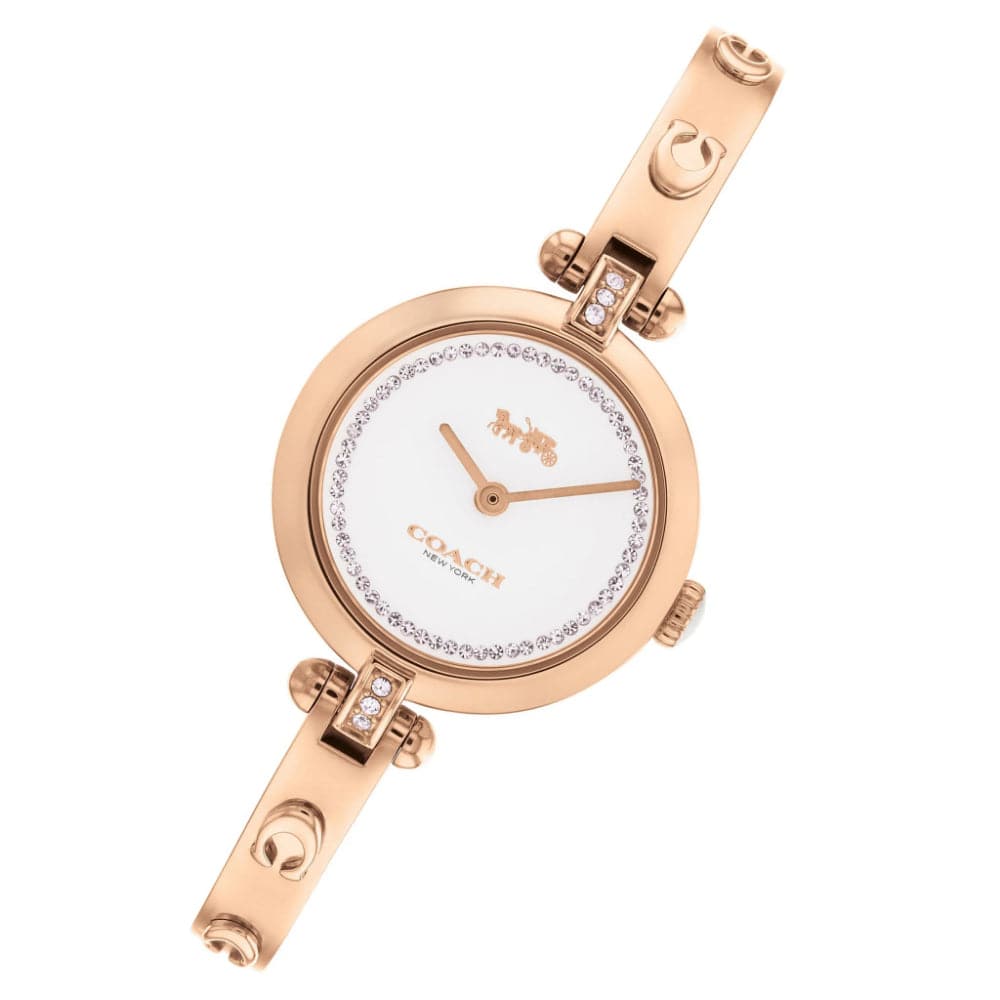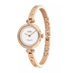 This timepiece is powered by quartz movement, with a 26mm diameter and 7.6mm thickness of ionic rose gold plated steel casing. A 6mm wide strap is also crafted out of durable ionic rose gold plated steel, and the face of the watch is shielded by a mineral crystal face. The dial is a luminous white and the watch is water resistant up to 3 ATM. A jewellery clasp closure ensures a secure fit.