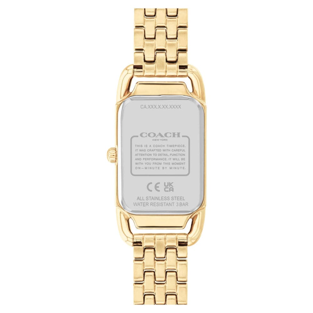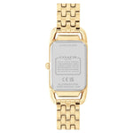 From COACH, the Cadie watch will monitor your valuable time in style, a must-have go to staple accessory for your everyday life. Featuring a 32.5mm gold-tone rectangular case, this remarkable timepiece is resilient with water-resistance up to 30 meters. It is powered by quartz movement, and the white dial exhibits gold-tone hands, round indices, and COACH’s iconic horse-and-carriage motif. The watch is fastened by a gold-tone bracelet with a push-button deploying closure.