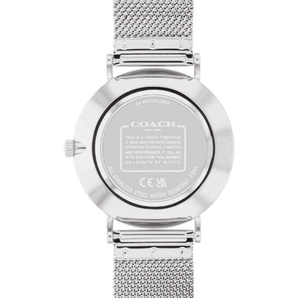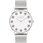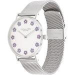 Ladies Coach watch from the Perry family. Featuring a 36mm round stainless steel case, powder white dial with lavender tea rose markers. Finished on a stainless steel mesh strap. Water resistant to 3ATM.