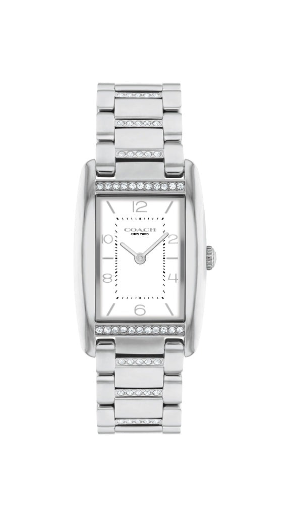 The Coach Reese watch combines minimalist design with a touch of sparkle, making it an elegant addition to any collection. Featuring a stainless steel case and bracelet, this timepiece showcases a white satin dial with numerical and stick markers, highlighted by sparkling crystals. Finished with the iconic Coach Signature on the clasp, it’s a stylish and functional accessory for everyday wear.