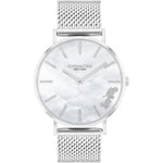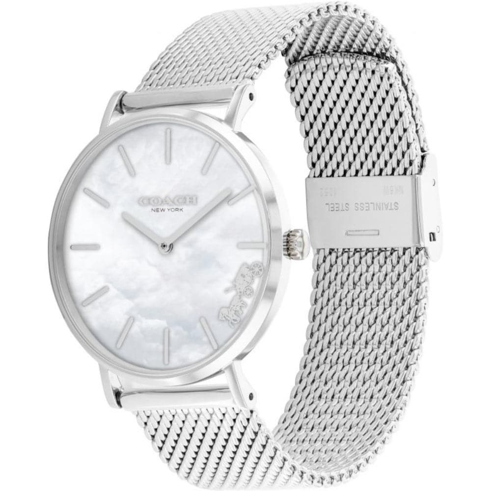 Named for a quiet street in New York City’s West Village, the Perry from COACH is a traditional round watch perfect for every day. This sleek Gift Set includes one 36mm stainless steel mesh bracelet timepiece featuring a luminous mother-of-pearl dial accented with the iconic Coach Horse and Carriage motif and a delicate slider bracelet detailed with the Coach Signature and cabochon stones. Wear together or separately.