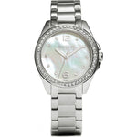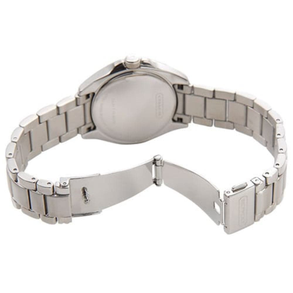 This ladies Coach Tristen watch has a stainless steel case and is fitted with an analogue quartz movement. It is fastened with a silver metal bracelet and has a mother of pearl dial.