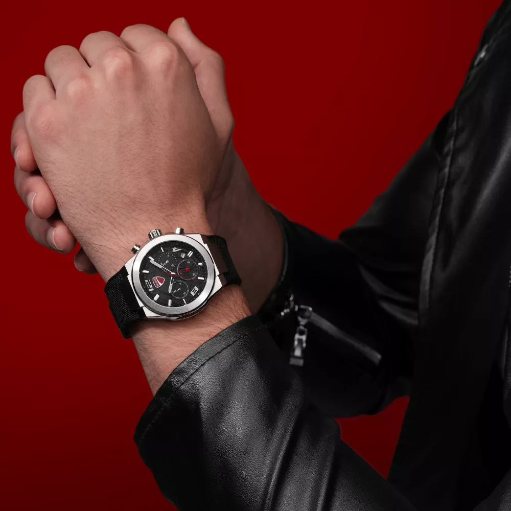 • ๐—›๐—ถ๐—ด๐—ต-๐—–๐—ผ๐—ป๐˜๐—ฟ๐—ฎ๐˜€๐˜ ๐—ฆ๐—ฒ๐—ฐ๐—ผ๐—ป๐—ฑ๐˜€ ๐—›๐—ฎ๐—ป๐—ฑ: A striking red seconds hand enhances visibility and reflects Ducatiโ€™s precision racing DNA.