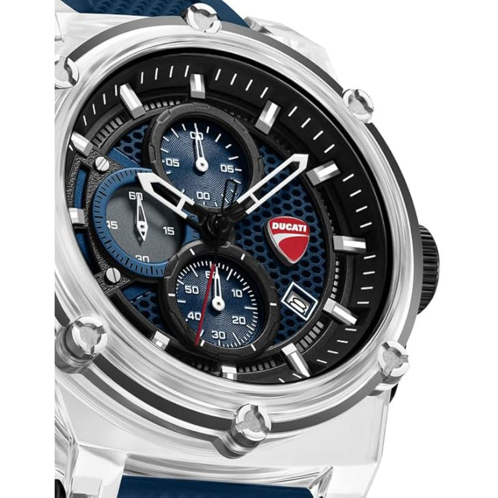 - ๐ฆ๐ฝ๐ผ๐ฟ๐๐ ๐ ๐๐๐ฐ๐๐น๐ฎ๐ฟ ๐๐ฒ๐๐ถ๐ด๐ป: Ducati DT010 features a bold 56mm case with a blue honeycomb-patterned dial, combining strength with modern aesthetics.