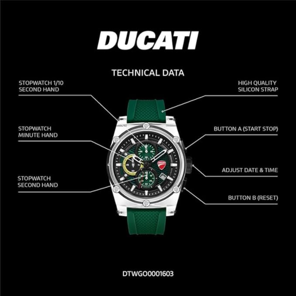 ๐๐ฟ๐ฒ๐ฒ๐ป ๐ฆ๐ถ๐น๐ถ๐ฐ๐ผ๐ป๐ฒ ๐ฆ๐๐ฟ๐ฎ๐ฝ: Durable green silicone strap provides long-lasting comfort, adapting to active lifestyles with Ducati-grade performance.
