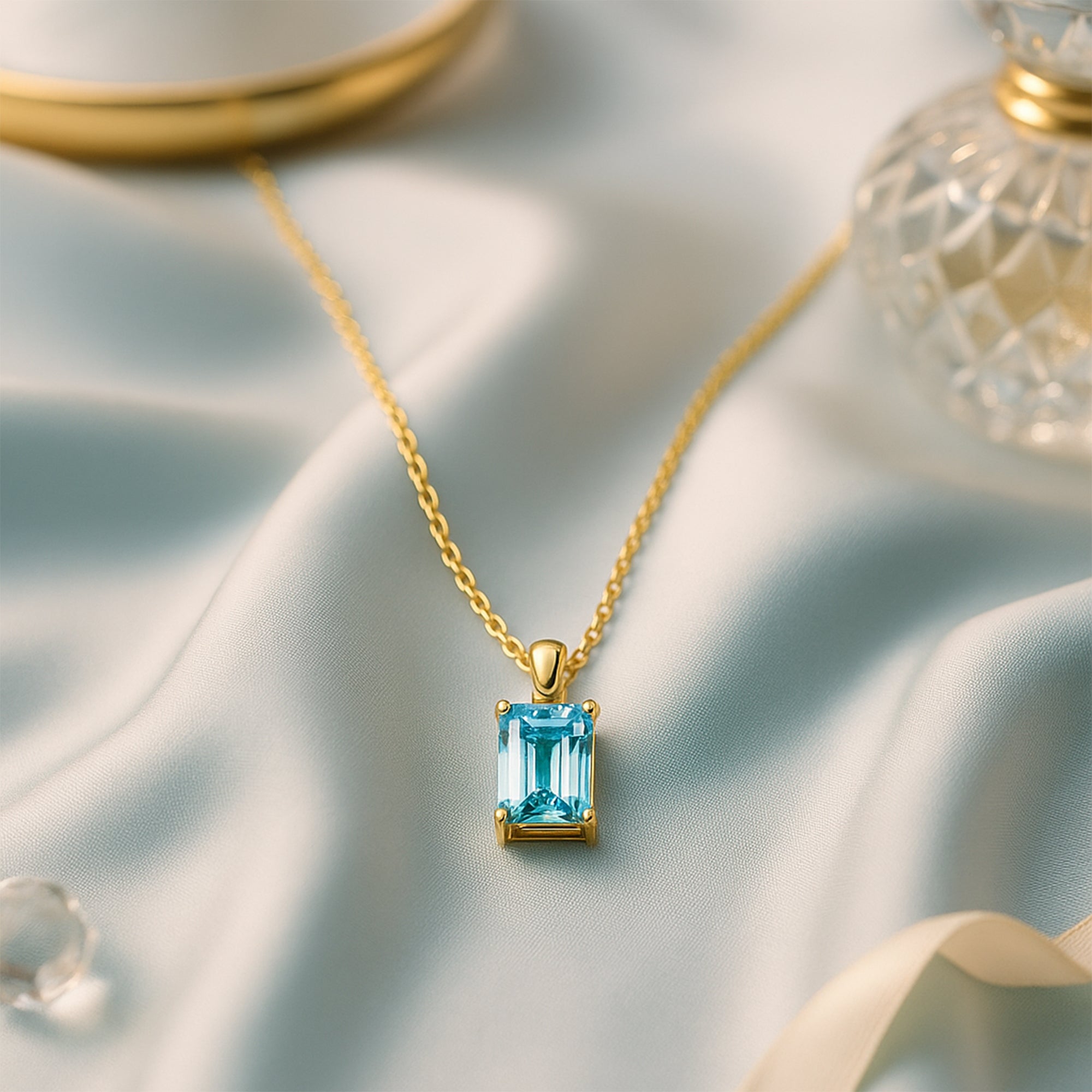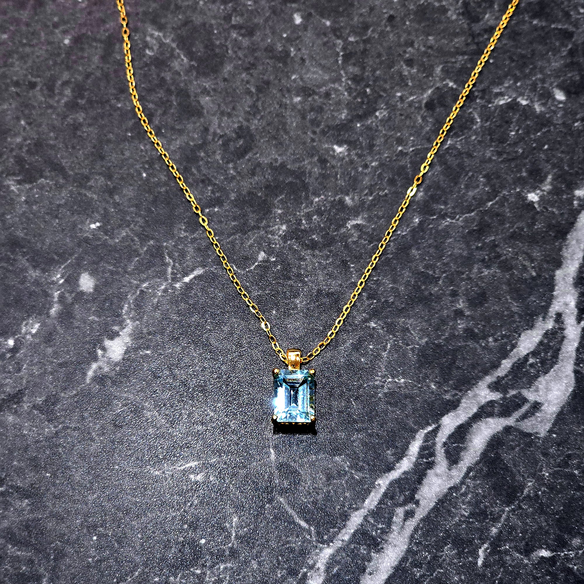 The Blue Radiance Pendant from AG Collective Jewelry is a celebration of clarity, confidence, and effortless grace. Featuring a stunning emerald-cut light blue gemstone, this necklace is set on a fine gold chain, letting the stone's brilliance take center stage.