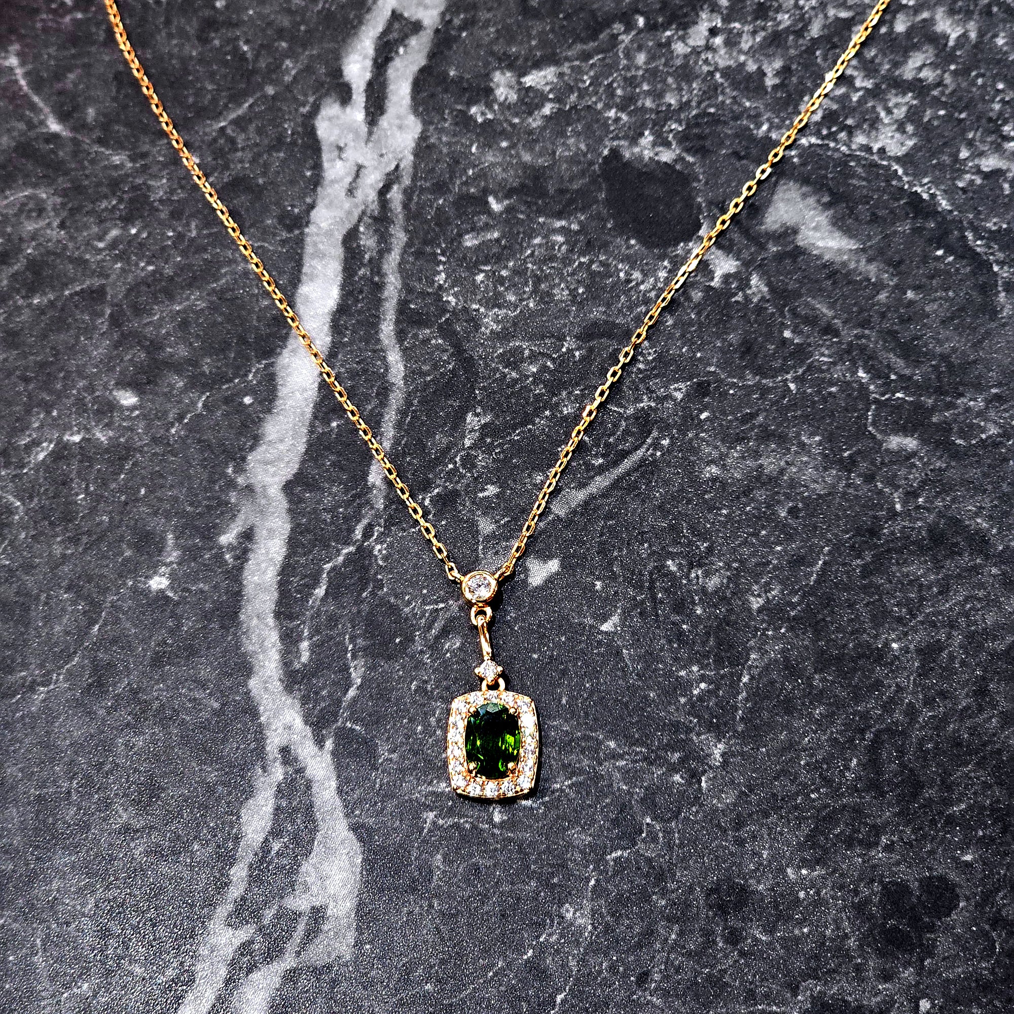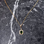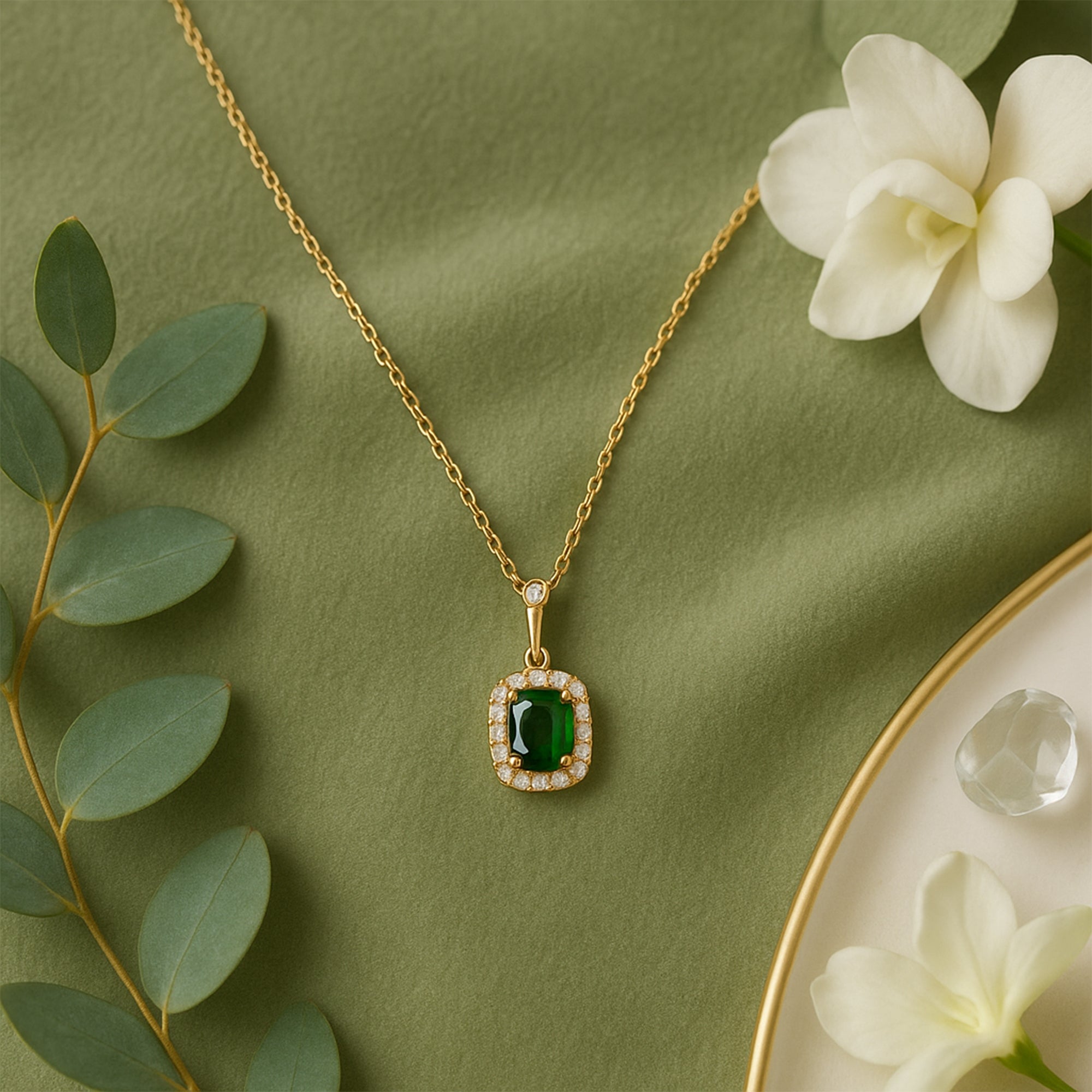 The Enchanted Emerald Pendant from AG Collective Jewelry is a masterclass in elegance and mystique. At its center lies a deep forest-green rectangular gemstone, symbolizing growth, protection, and inner power. Framed by a halo of brilliant white stones, the pendant radiates an aura of timeless sophistication.