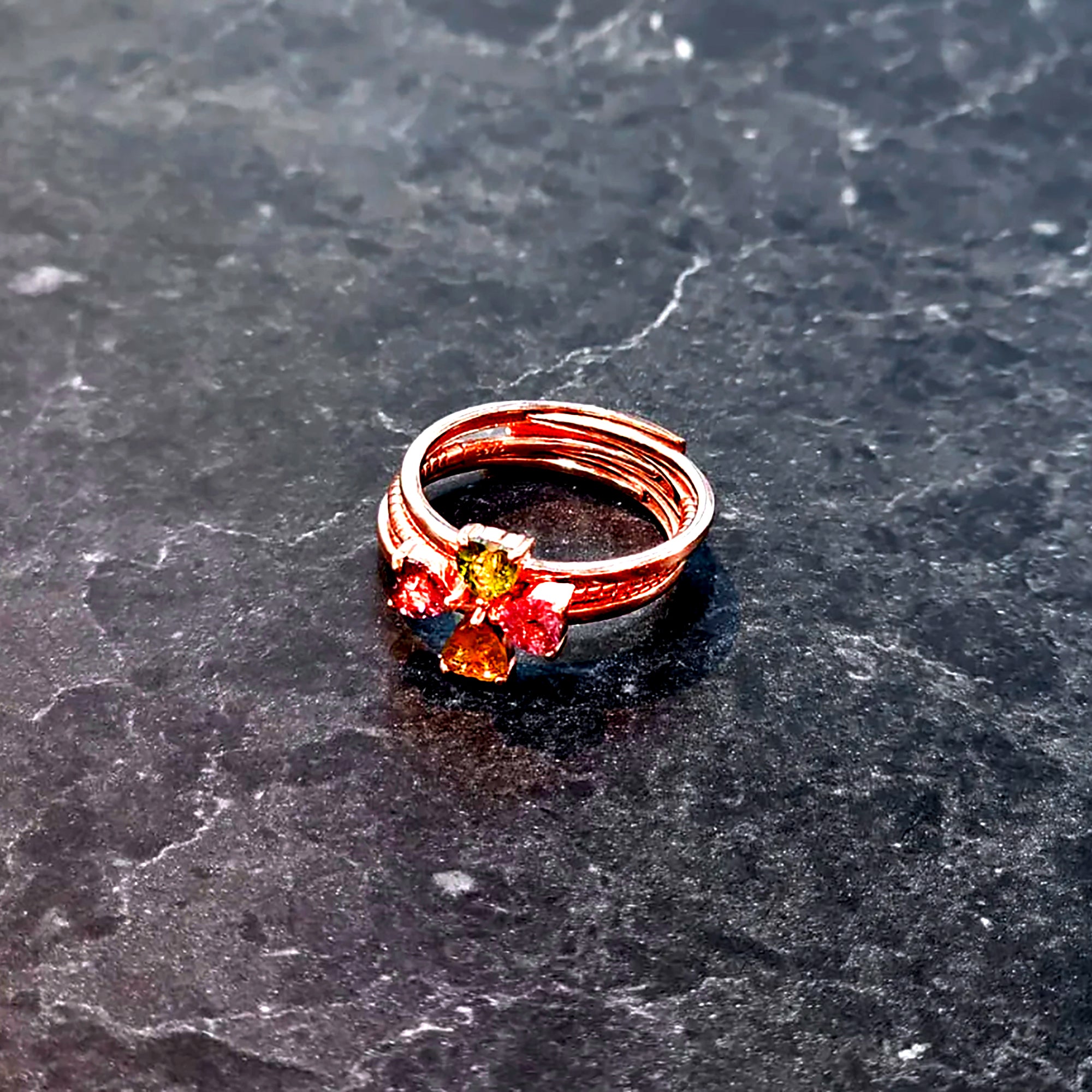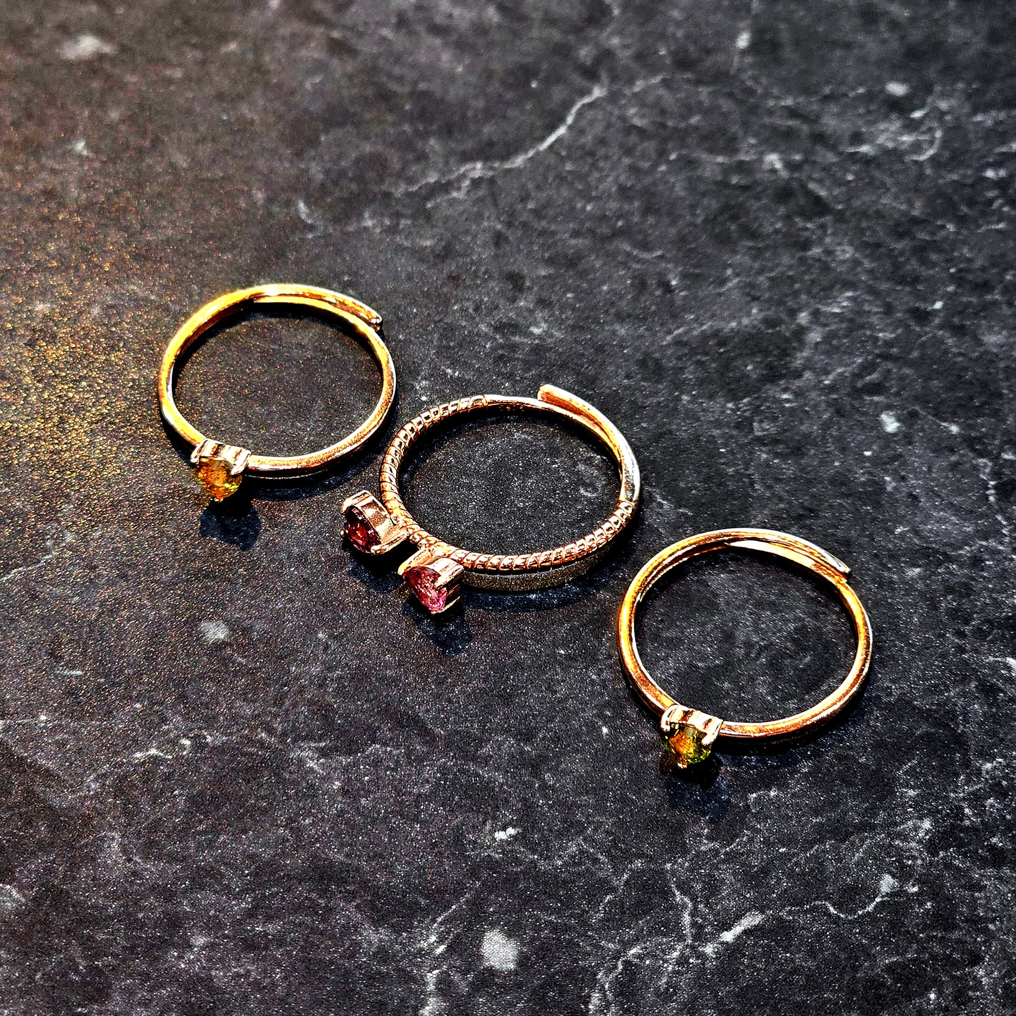 Each ring in the set features a uniquely cut crystal — from soft olive to deep moss green, and a romantic rose hue — held delicately by polished gold bands. Whether worn individually for a touch of earthy charm or stacked for a modern statement, these rings whisper elegance without ever trying too hard.