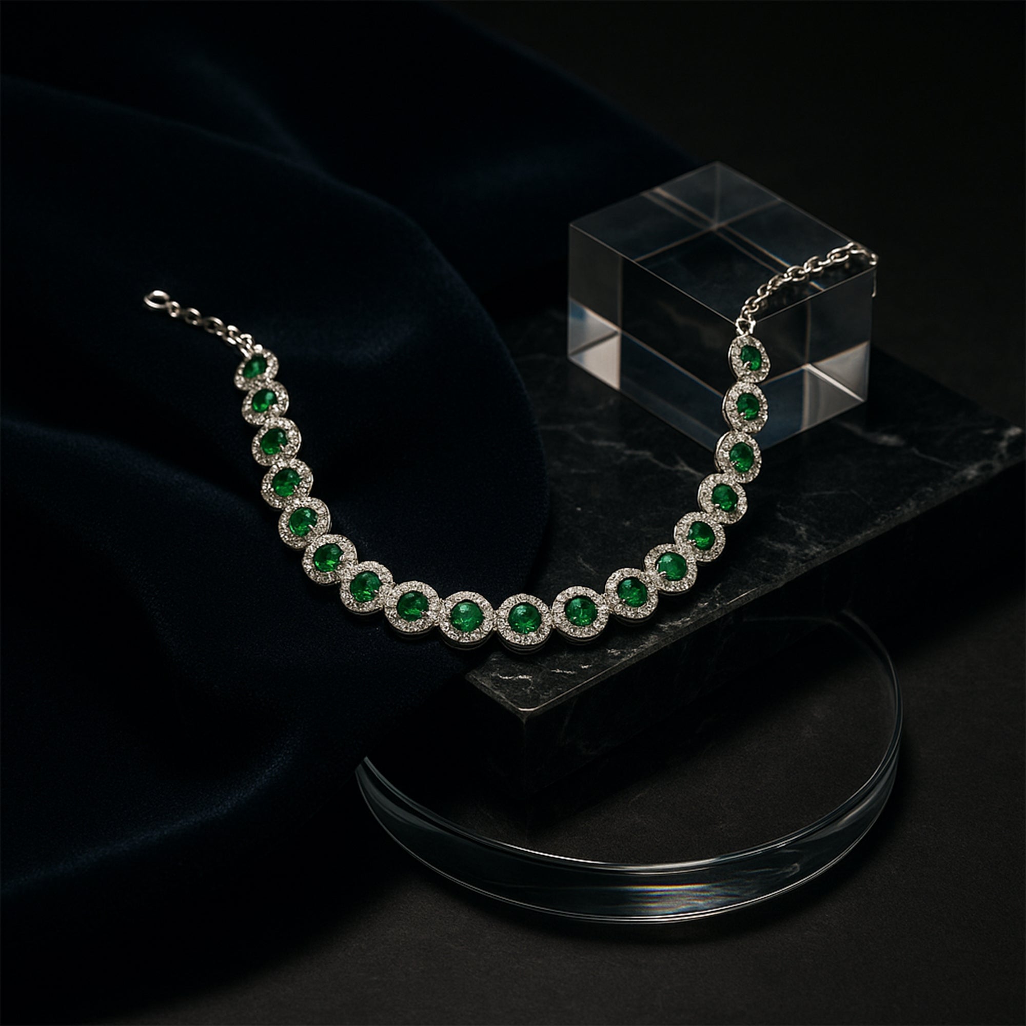 The Verdant Halo Bracelet from AG Collective Jewelry brings together classic luxury and bold natural beauty. Each link features a vivid green gemstone — symbolizing renewal and abundance — surrounded by a shimmering halo of crystal-clear stones that enhance its brilliance and depth.