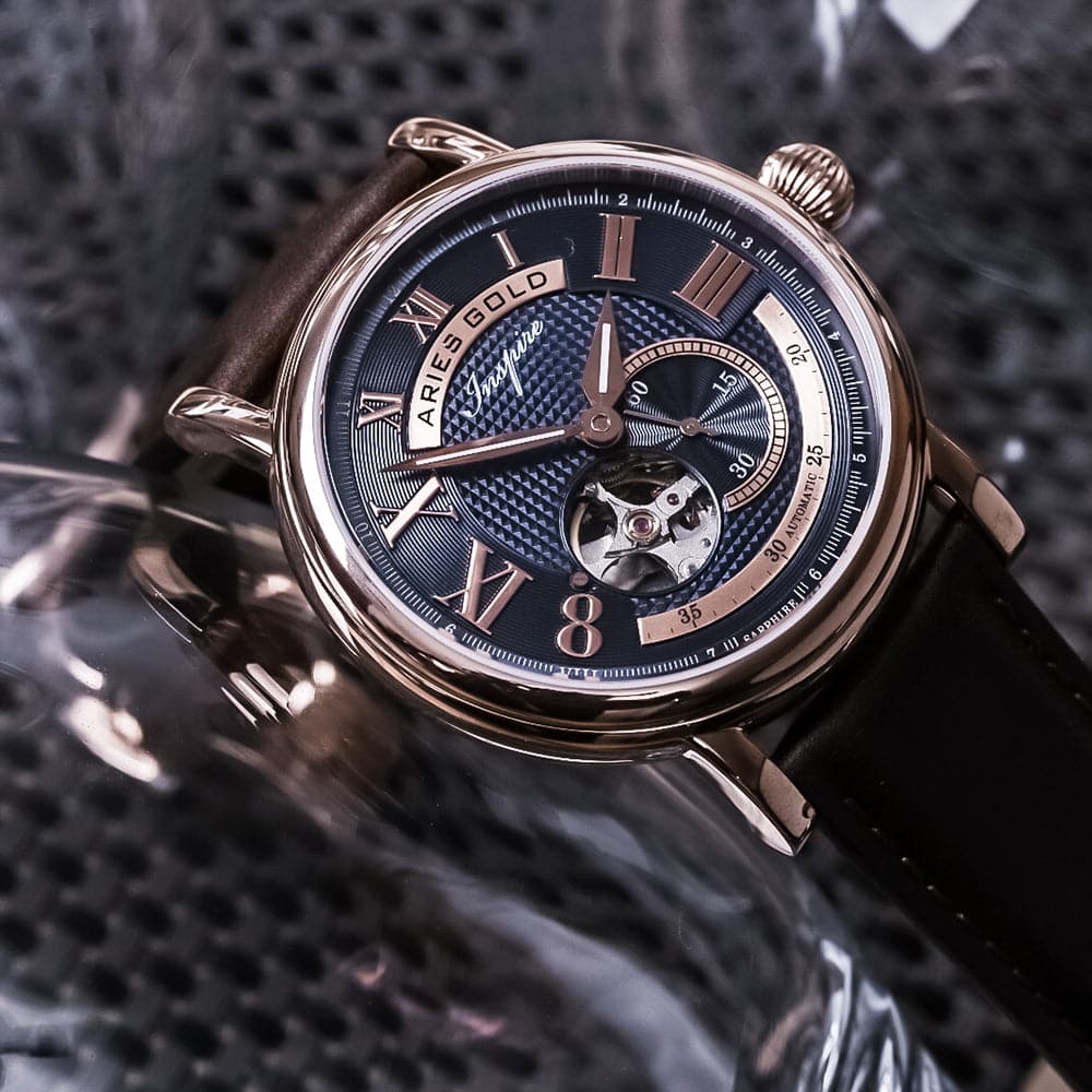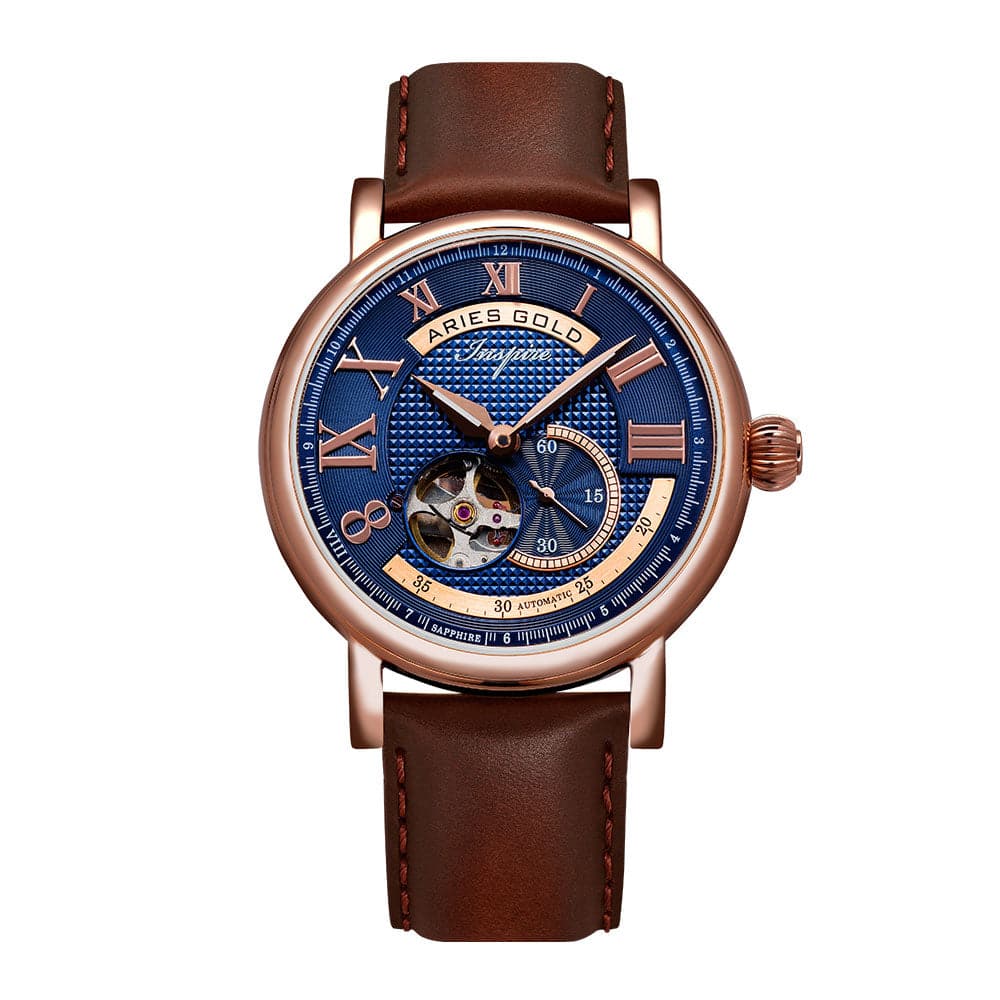 ARIES GOLD AUTOMATIC INSPIRE GAUNTLET VINTAGE ROSE GOLD STAINLESS STEEL G 903A RG-BU BROWN LEATHER STRAP MEN'S WATCH - H2 Hub Watches