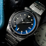 Emerging from the ocean's heart, the Black Sea isn't just a dive watch; it's a statement. Six months of relentless refinement sculpted a 43mm brushed steel titan into a form half a century old, yet distinctly modern. Beneath a boxed mineral crystal, a unique semi-skeletonized hand dance with luminous indexes, slicing through the darkest depths with Super Luminova's unwavering glow. The workhorse Seiko NH35a whispers reliability within, its rhythm undeterred by the ocean's crush. Choose from 3 captivating dial textures and leather or steel straps, each ready to conquer sea, sky, or boardroom. For the adventurer, the executive, the dreamer, the Black Sea isn't just on your wrist; it's in your veins. Taking the form of a design over half a century old that is still as distinct and timeless today. A design that took over two years of painstaking research and development gruelling tests and quality control standards to produce. A vintage styled diver that embodies the spirit of what we believe watches are and should be.