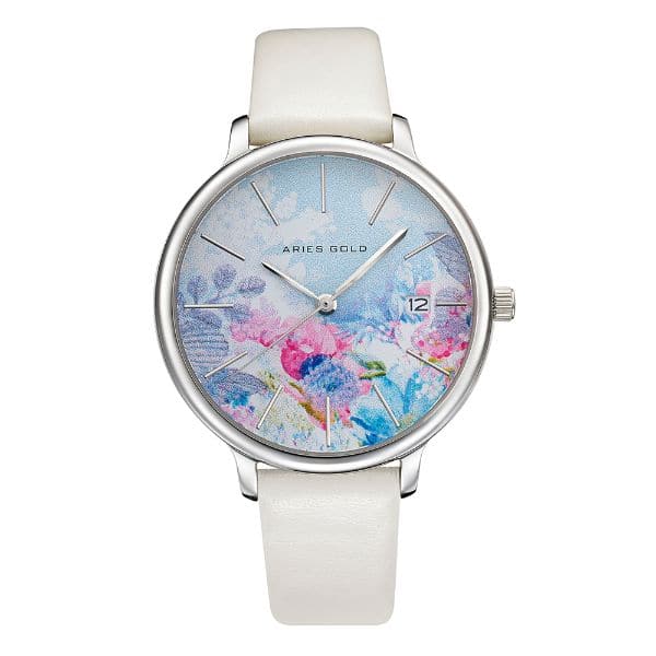 ARIES GOLD ENCHANT FLEUR SILVER STAINLESS STEEL L 5035 S-BUFL LEATHER STRAP WOMEN'S WATCH