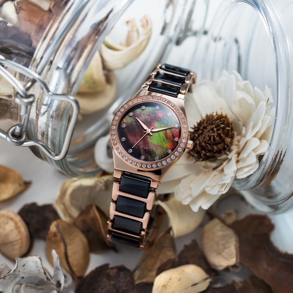 A slender elegant case housing an exquisite mother-or-pearl dial adorned with applied crystals and slim sharp hands. Paired on a 3-piece bracelet with a mixture of ceramic and steel to make for a perfectly sophisticated match. The Capella is the embodiment of feminine charm and modern refinement.