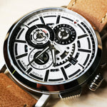 Made like a mechanical beast, it took our engineering team more than 18 months to produce the Hawk 7018. Inspired by the vintage mechanical aerial beasts of the 1960s, the watch has a military styled brushed and sandblasted styled casing. The layered finishing of the watch casing speaks volumes of the attention to detail by our engineering team. The skeletal watch dial design is made to resemble the complex mechanism of the plane engines. The vintage looking watch straps gives the watch a dapper look despite its sporty appearance. Extremely complex and difficult to assemble, with more than 7 layers, each piece of Hawk can only be assembled by 1 single Master Watchmaker one at a time. Lastly, the anti-reflective coating, the sapphire glass and the workhorse Japanese quartz chronograph movement from Seiko gives you every reason to invest in a hardworking watch that can last you a lifetime.
