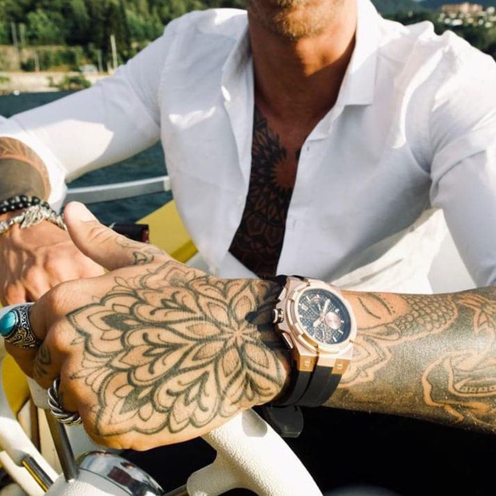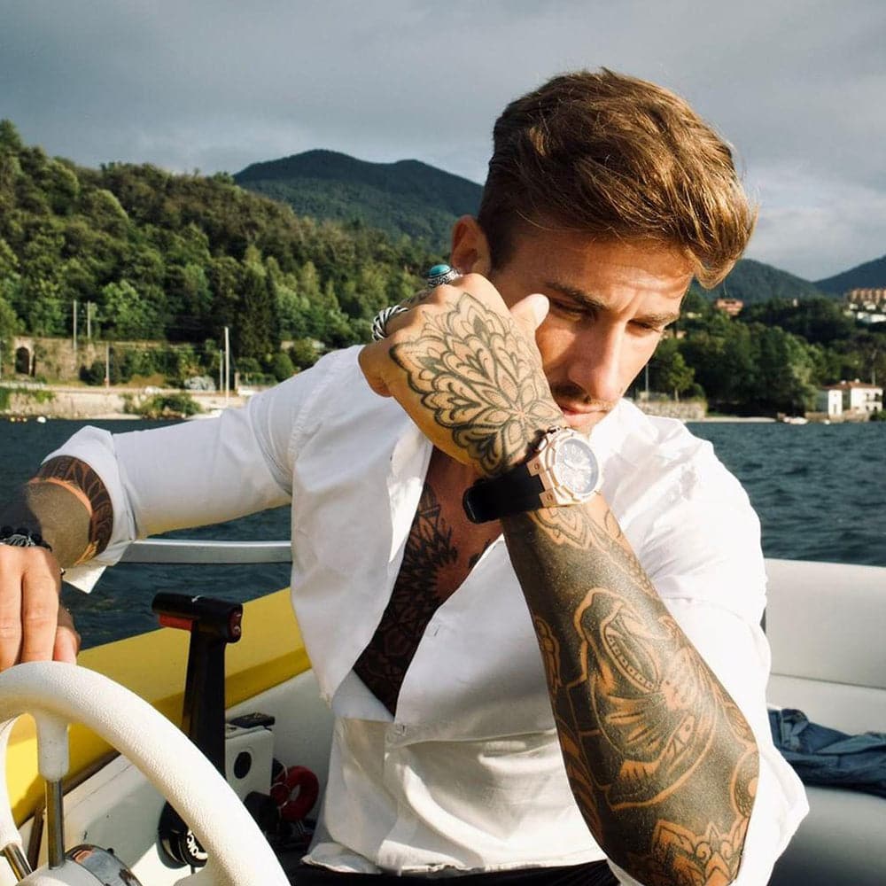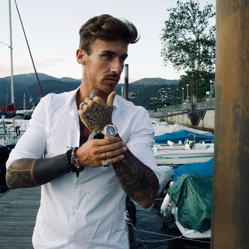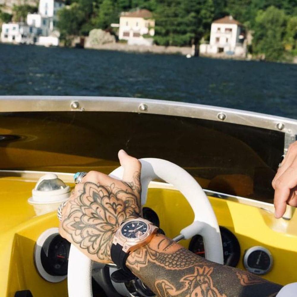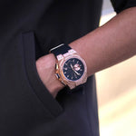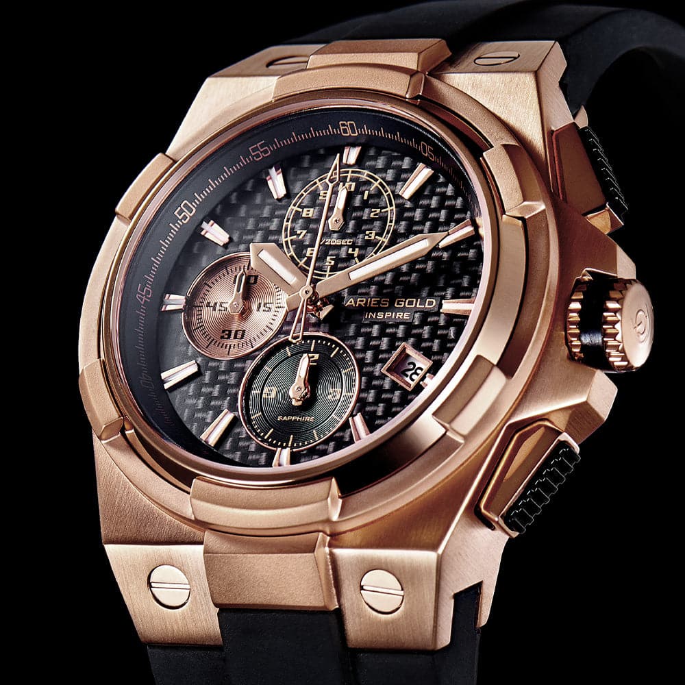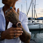A brushed and polished angular case adds an iconic industrial yet refined aesthetic to the aggressive design. The segmented bezel and exposed lug screws gives a refined and technical composition to the timepiece.
