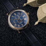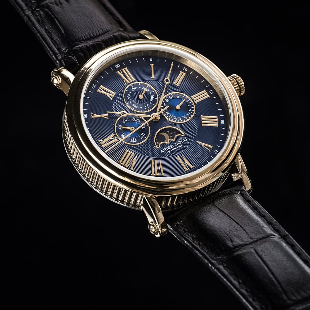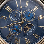 A timepiece that celebrates and embodies the intricate and artistic designs of an age-old complication: The triple calendar and sun/moon indicator. With elegant roman numerals and Breguet hands, along with detailed finished such as the coin edge centre case and hobnail guilloche patterning on the dial, the Kensington offers what is commonly known to be an inaccessible complication and design at an affordable level to the masses.