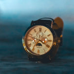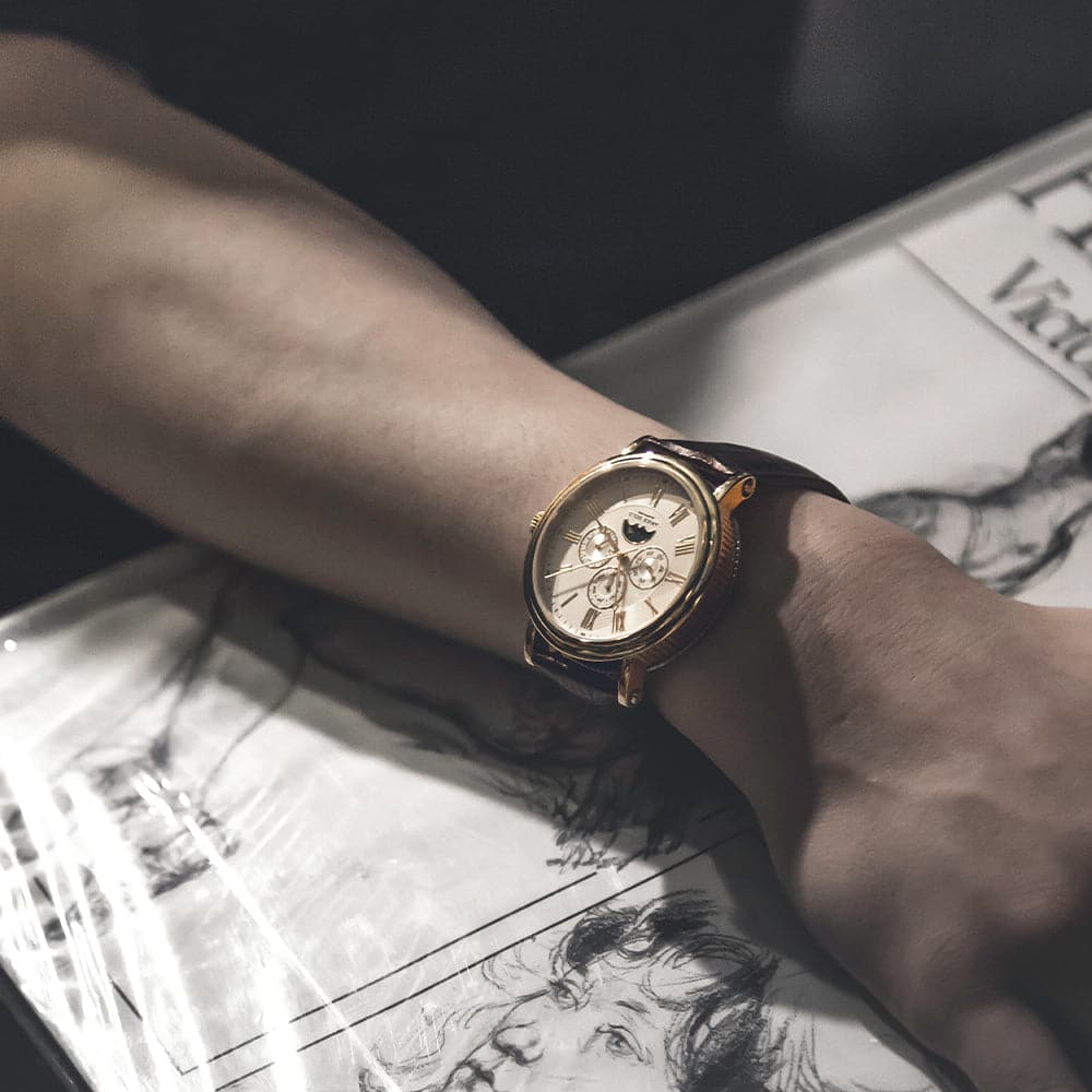A timepiece that celebrates and embodies the intricate and artistic designs of an age-old complication: The triple calendar and sun/moon indicator. With elegant roman numerals and Breguet hands, along with detailed finished such as the coin edge centre case and hobnail guilloche patterning on the dial, the Kensington offers what is commonly known to be an inaccessible complication and design at an affordable level to the masses.