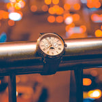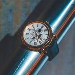 Think of the quintessentially British, and fabled names immediately spring to mind: The River Thames, Big Ben, High Street… even Kensington Palace. Inspired by the London-based royal residence, the Kensington harks back to the days of vintage magnificence, reminiscent of Anglo-Saxon aesthetics with a striped texture lining the sides of its brushed metal casing. This exquisite timepiece also features a Japanese moonphase movement that hints at an aristocratic lineage – further substantiated by a real leather strap reinforced with extra padding to provide greater water resistance. A sapphire glass crystal serves as the coup de grace, preserving the Kensington’s internal mechanisms and air of supremacy.