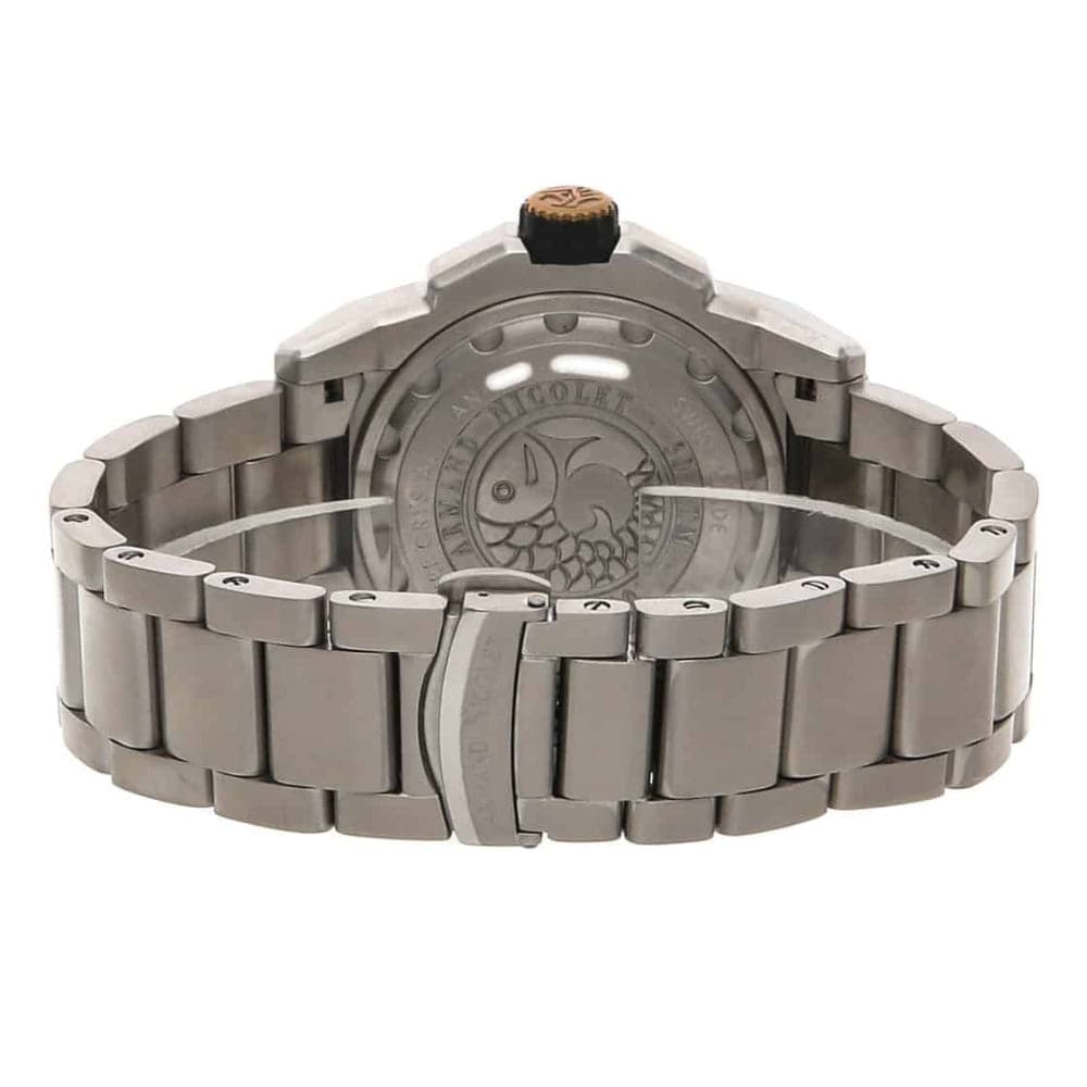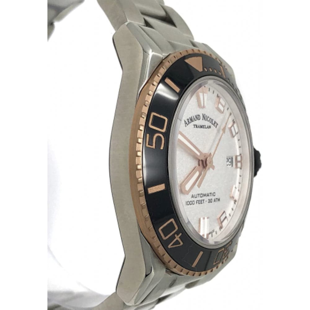 Calibre AN200 for Date (based on ETA 2824-2 modified per Armand Nicolet’s specifications). Dial with luminous indexes and hands. Case with antiglare treated sapphire crystal. Screwed back. Turning black ceramic bezel.