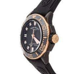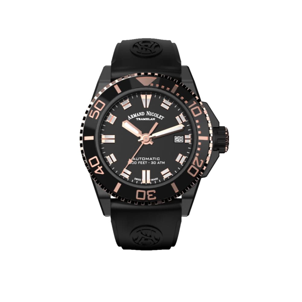 Calibre AN200 for Date (based on ETA 2824-2 modified per Armand Nicolet’s specifications). Dial with luminous indexes and hands. Case with antiglare treated sapphire crystal. Screwed back. Turning black ceramic bezel with rose gold plated crown.