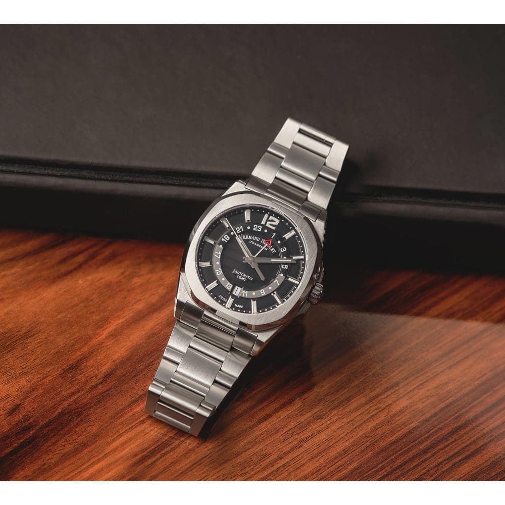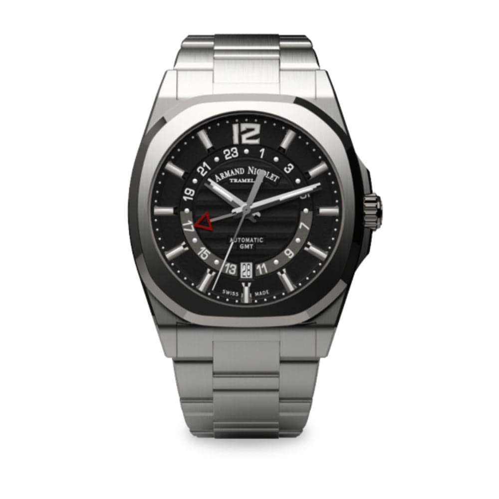 Mechanical automatic movement with GMT functions. Caliber AN330 for GMT functions (based on ETA 2893-2 modified per Armand Nicolet’s specifications). Guilloché dial with luminous indexes and hands. Case with antiglare treated sapphire crystal on top and sapphire crystal in the see-through screwed back