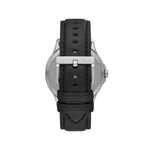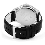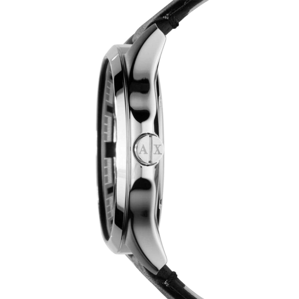 An attractive mens Armani Exchange watch with a stainless steel case and black genuine leather strap. This slick design has a round clear face,black colour dial, silver colour baton hour markers, attractive branding and date function. The watch is powered with a quality Japanese quartz movement.