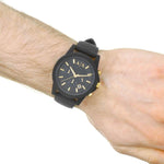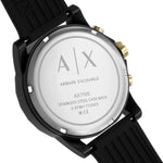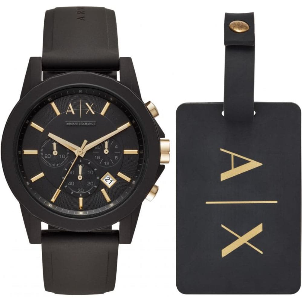The super-slick black-and-gold color scheme delivers a strong look. The jet-black dial features bold gold hour markers and hands, with gold accents on the date window and chronograph hands. The branded black rubber strap is durable and hardwearing, and provides the finishing touch to this smart, stylish watch. Accompanying the watch is a branded Armani Exchange luggage tag, also in black and gold with the iconic A|X logo. Attach it to your bags and you’ll always arrive in style.