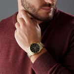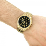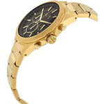 Gold-tone stainless steel case and bracelet. Fixed gold-tonebezel. Black dial with gold-tone hands and index hour markers. Minute markers around the outer rim. Dial Type: Analog. Date display at the 6 o'clock position. Quartz movement. Scratch resistant mineral crystal. Push / pull crown. Solid case back. Round case shape, case size: 44 mm, case thickness: 12 mm. Band width: 21 mm. Deployment clasp with a push button release. Water resistant at 100 meters / 330 feet. Functions: chronograph, date, hour, minute, second. Sport watch style. Armani Exchange Drexler Chronograph Black Dial Mens Watch AX2611.