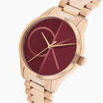 The Iconic Unisex Burgundy Analog Stainless Steel Watch (25200347) is a stylish and versatile timepiece suitable for both men and women. Its round stainless steel case measures 32mm in diameter, making it a sleek and compact accessory. The watch features a captivating burgundy analog dial powered by a precise quartz movement, ensuring accurate timekeeping. With a water resistance rating of 3 ATM, it can withstand daily exposure to splashes and moisture. The 16mm-wide stainless steel rose gold strap complements the overall design and fastens securely with a convenient push-button deployment clasp. Crafted in the USA, this watch has a slim profile with an 8mm thickness and weighs 227 grams, making it comfortable for everyday wear.