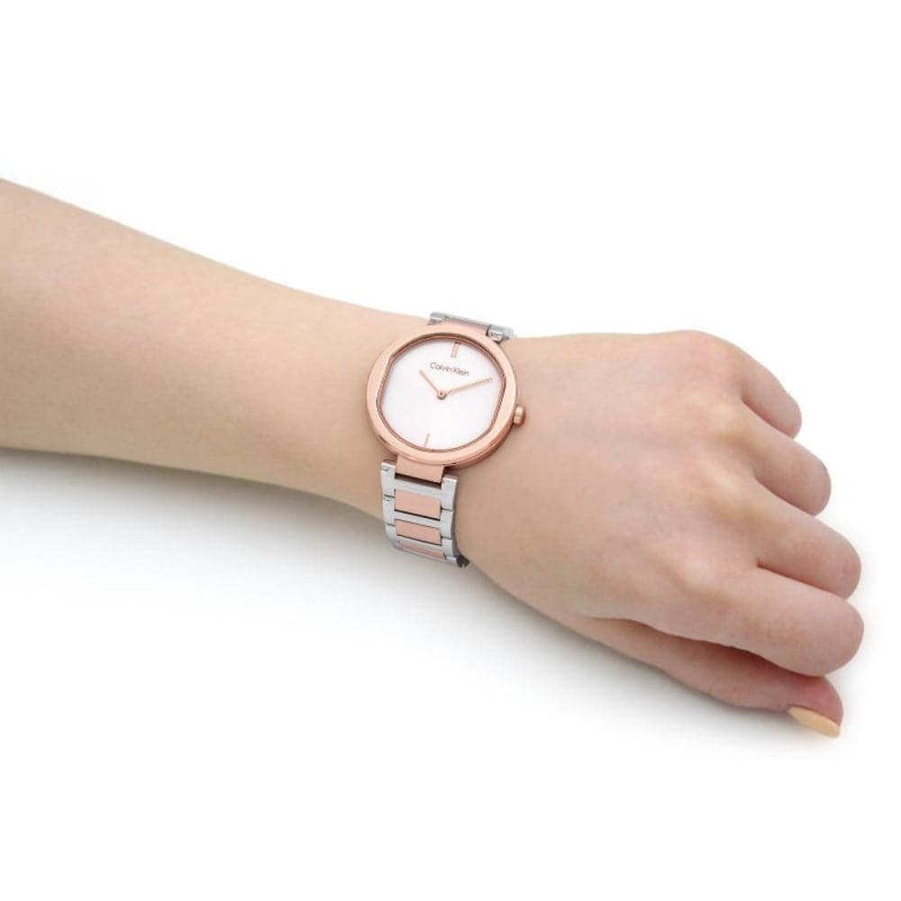 Women's watch from Calvin Klein. Featuring a 36MM round carnation gold case, light grey sunray dial and finished on a bi-color link bracelet.