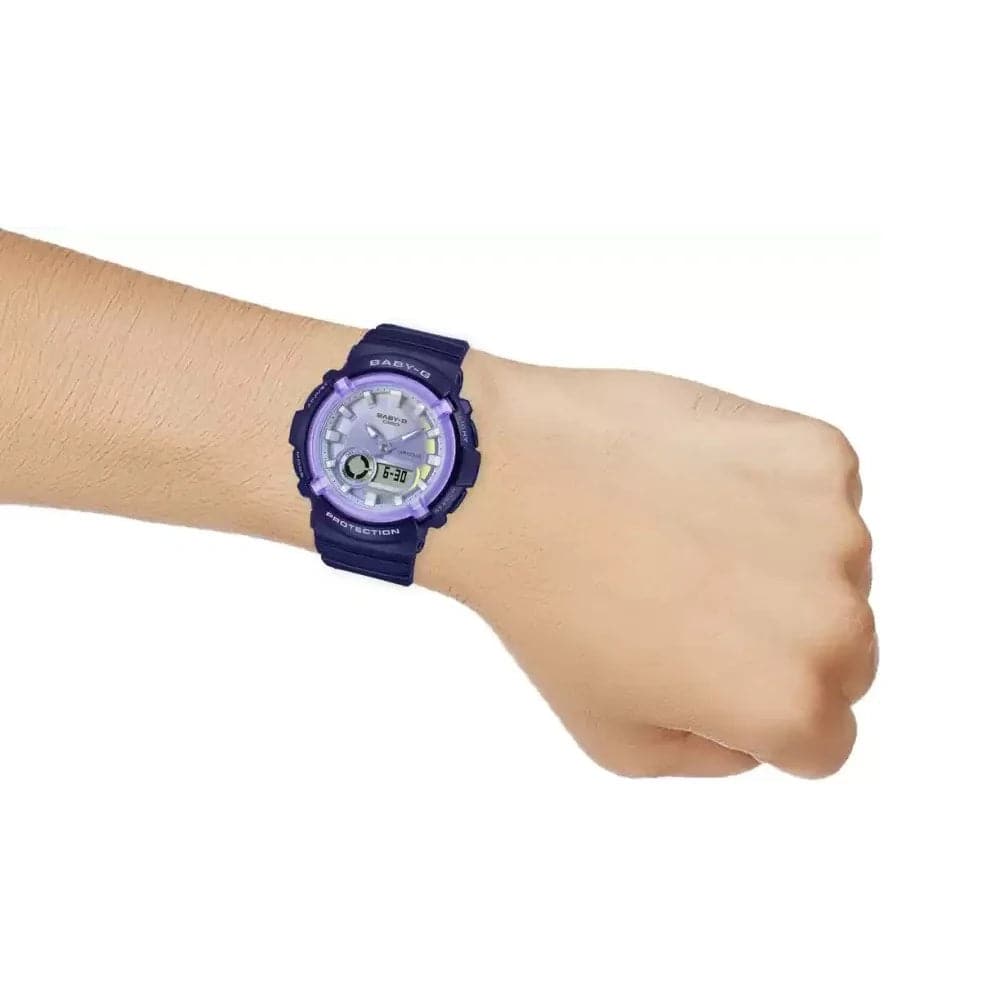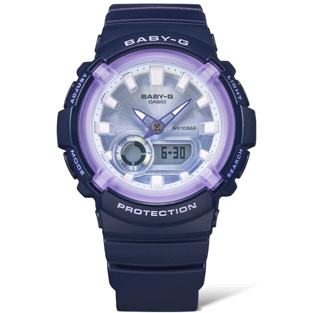Indulge your fancy with one of these mysterious and magical BABY-G watches with a virtual flair. We start with the BGA-280, and its characteristic round face, adding a polarized finish to the dial. This glossy take on an iconic watch creates a design with a nostalgic yet somehow futuristic feel. These watches deliver practical functionality, as well, with shock-resistant construction and water resistance up to 100 meters. Each tilt of the wrist alters the interplay of light and color. Let yourself be captivated by a timepiece that invites you into a world of fantasy.
