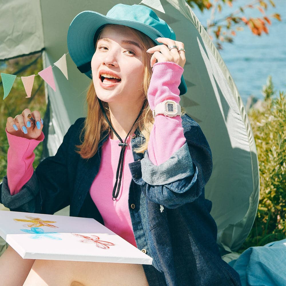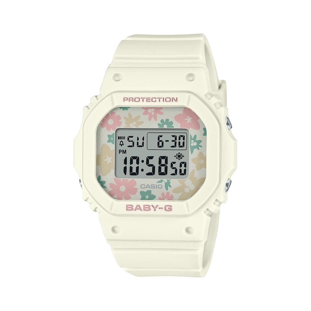 The iconic look of BABY-G takes a captivating step back in time. The ever-popular compact design of the BGD-565 showcases retro pop colors and nostalgic details. The charming floral pattern on the watch face is inspired by fields of flower. Activate the backlight and the blooms are echoed in the center display.