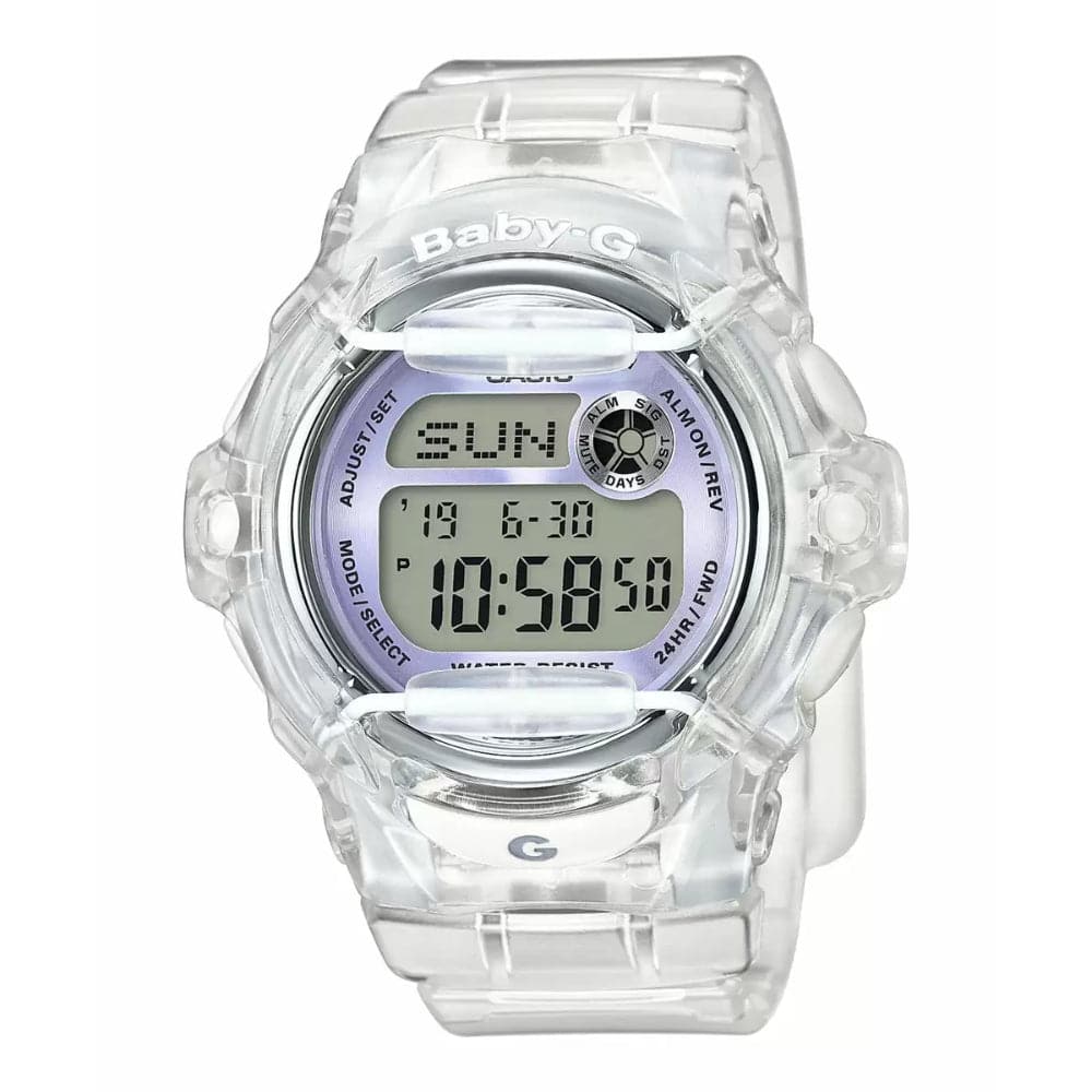 From the BG-169 Series, these watches features a collection of new models that combine eye-catching colors and semi-transparent resin in making these watches. The basic semi-transparent resin coloring is combined with pink gold colored components for a total of great looking color combinations. Face protectors not only perform an important function, they also clearly identify this watch as BABY-G models. Though compact in size, this model is water resistant up to 200 meters. The metal ring around the face of the BG-169G is ion plated for a lustrous touch.