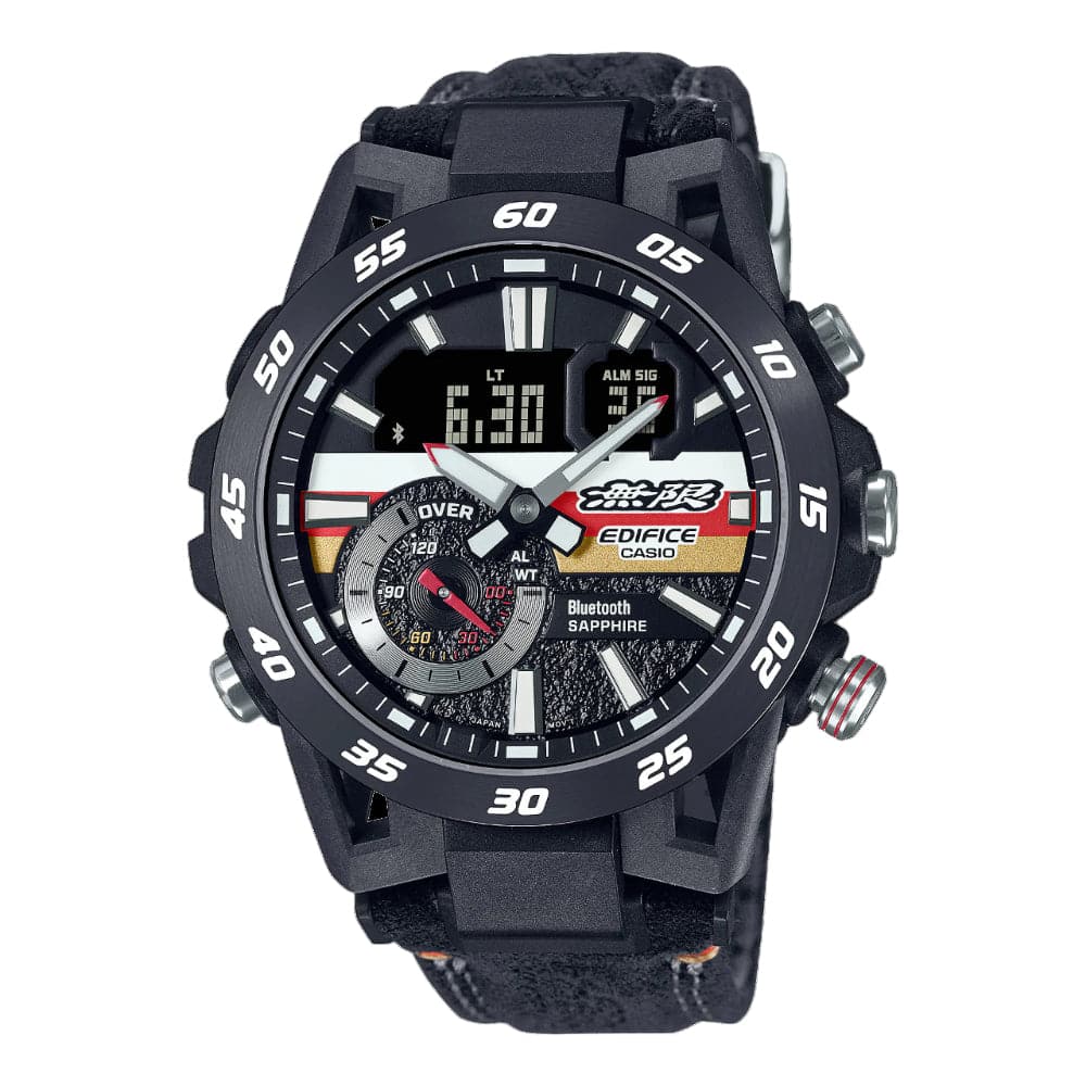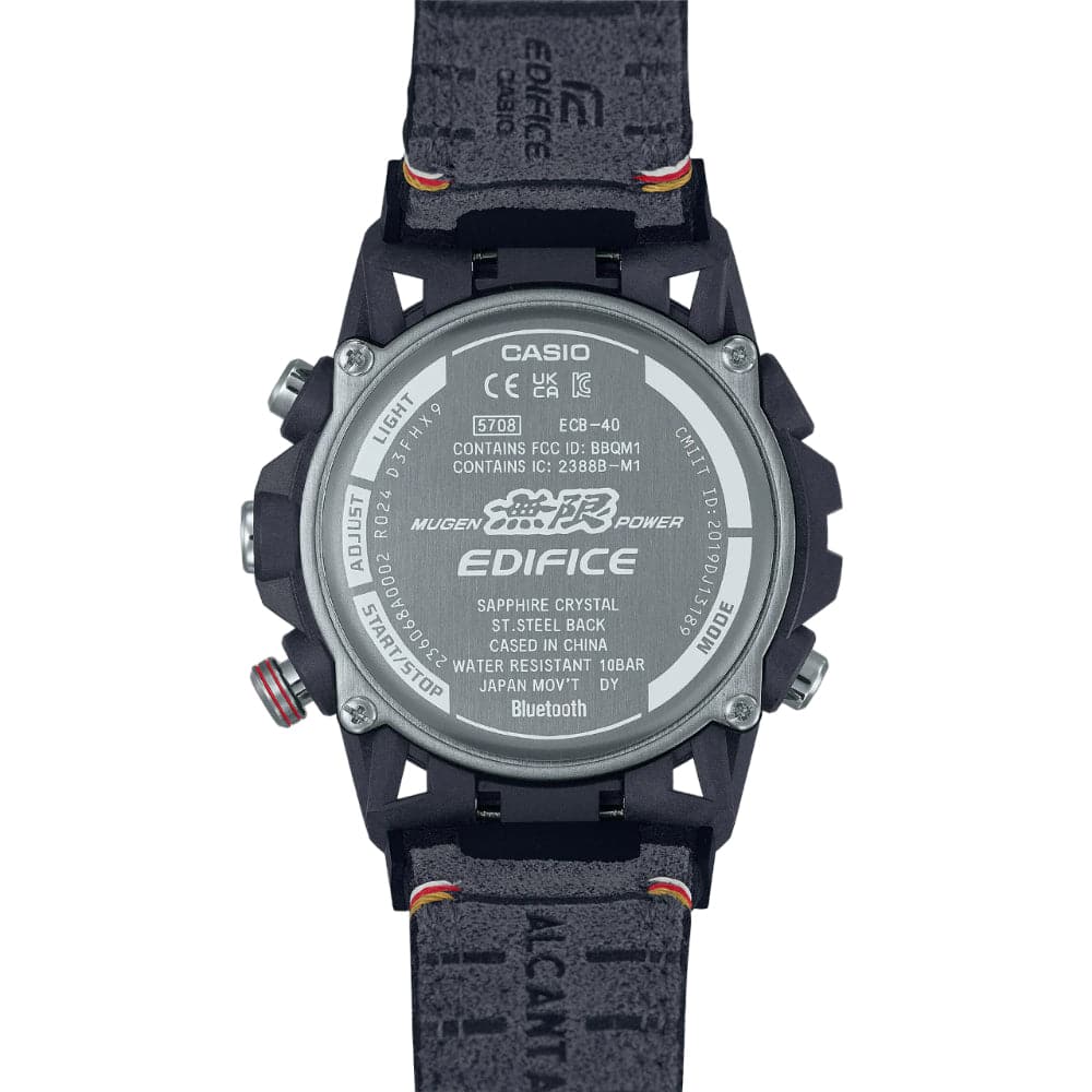 The EDIFICE MUGEN EDITION embodies the identity of the world-renowned MUGEN brand, developer and manufacturer of racing engines and aftermarket parts for Honda cars. The MUGEN logo and four brand colors — white, red, gold, and black —are featured on the dial, the band and band loop. The band is made of soft, durable Alcantara material and stamped with the iconic MUGEN symbol, the “Eye Commander.” Even the minute display on the bezel features a font provided by MUGEN.