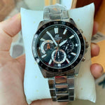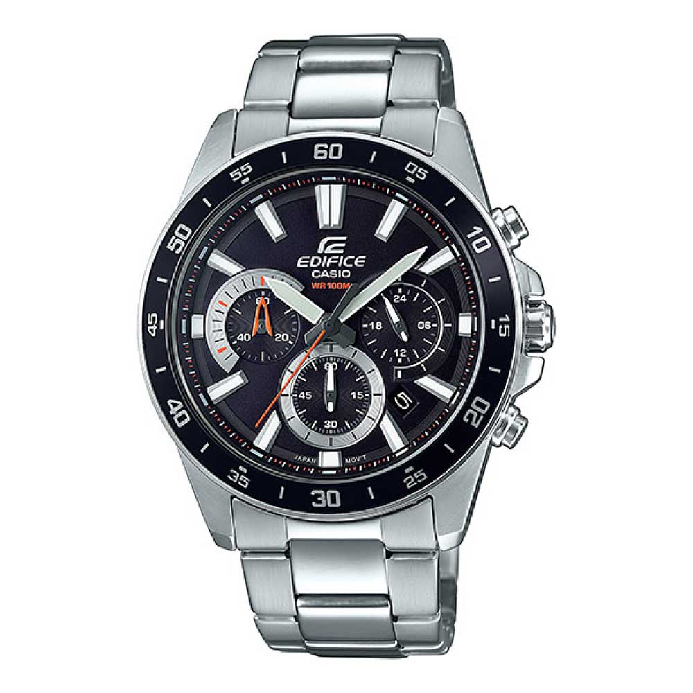 A mid-size standard EDIFICE chronograph. Use of a thick inset dial creates a dynamic design.