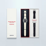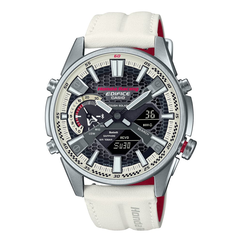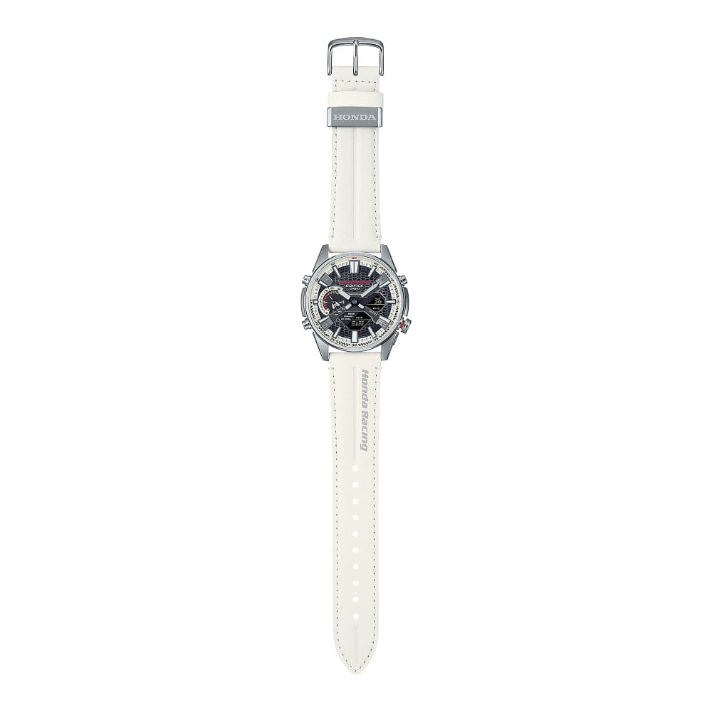 It’s time to pay tribute to Honda for its distinguished F1™ history and indomitable racing spirit — with the EDIFICE Honda Racing Championship White Edition. Designed in collaboration with Honda Racing, the EDIFICE homage to the first Honda racecar on the Formula One™ circuit embodies the RA271 and its 1964 debut. Every detail of the race car is reproduced here, with key watch face components painted in authentic championship white, a genuine leather band in white for true ’60s racing style, with a red back to evoke the Honda team racing spirit. The checkered flag motif adorning the watch glass adds the final touch to celebrate Honda Racing’s glory. Bluetooth® functionality ensures precision timekeeping and effortless calibration to local time anywhere in the world. With scratch-resistant sapphire crystal and solar power technology, this timepiece delivers the engineering you need to manage your day with the confidence of an F1 driver. Comes with interchangeable nylon band in black and special packaging sure to satisfy the most passionate racecar fan.