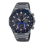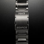 Inspired by the luxury sports cars in TOM’S line of complete vehicles, this special collaborative design says pure luxe all the way. Gorgeous gold-color accents flash on the second hand, on the racing team logo on the carbon dial, and on the indicator hand of the inset dial at the 6 o’clock position. The case back and clasp are engraved with TOM’S and EDIFICE logos, as well.