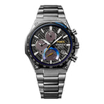 For a bold, fiery touch, the lower inset dial evokes the color gradation of a titanium tail pipe as it heats up. And the black ion plating on the octagonal bezel and the gray ion plating on the case and band deliver a scratch-resistant timepiece with the look and feel of complete luxury.
