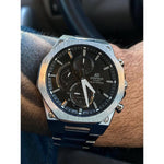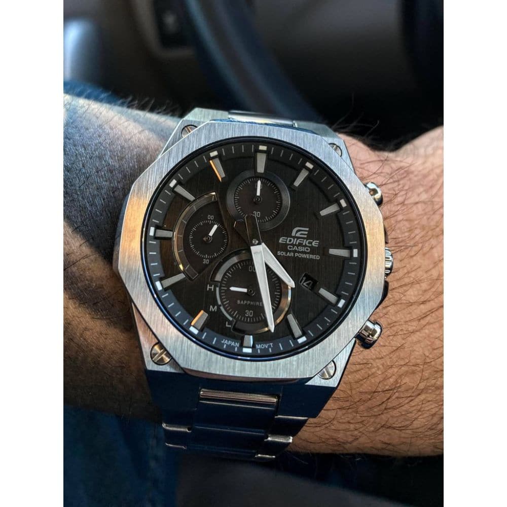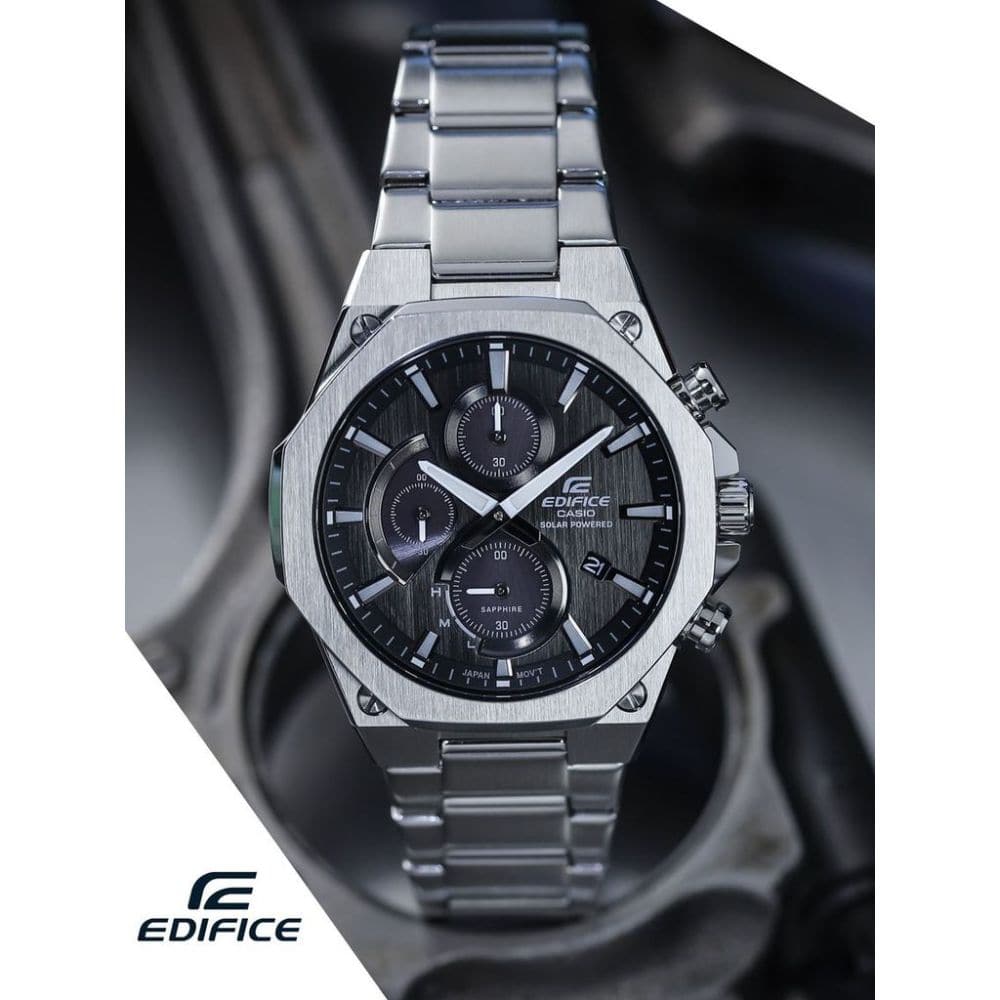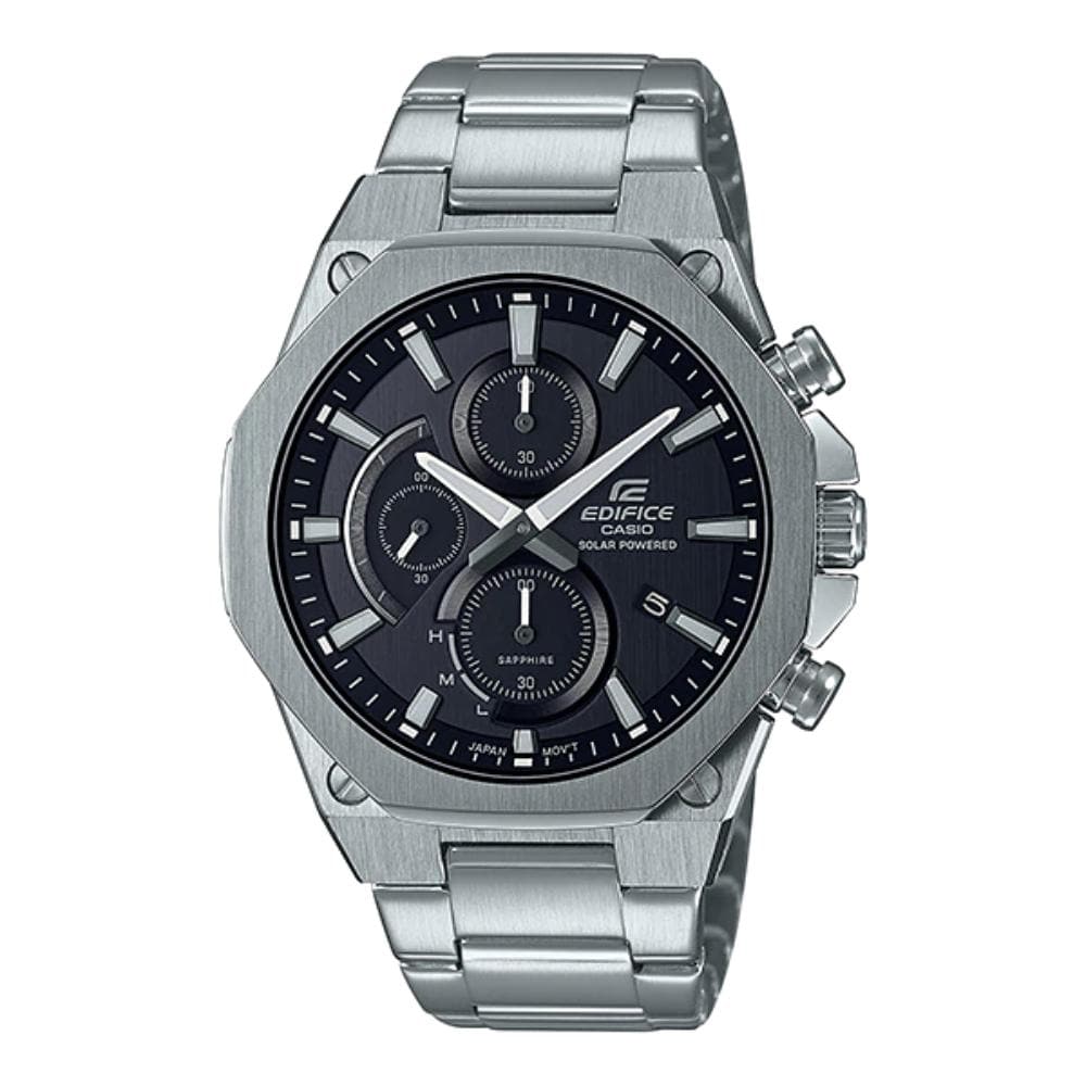 Slim Solar Powered Chronograph with Sapphire Crystal | Although multi-hand chronograph cases tend to be thick, this is a solar powered chronograph with a case kept to a thickness of 9.7 mm to provide an enhanced fit. The watch boasts a flat octagonal bezel with a hairline finish that creates a sporty yet luxurious design. Uses a scratch-resistant sapphire crystal.