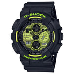 This new G-SHOCK model features digital camouflage pattern on metallic face that result in subdued designs. Base model is GA-140, the analog-digital timepieces. The basic black coloring of this model is offset by vivid yellow accents for a cool look.