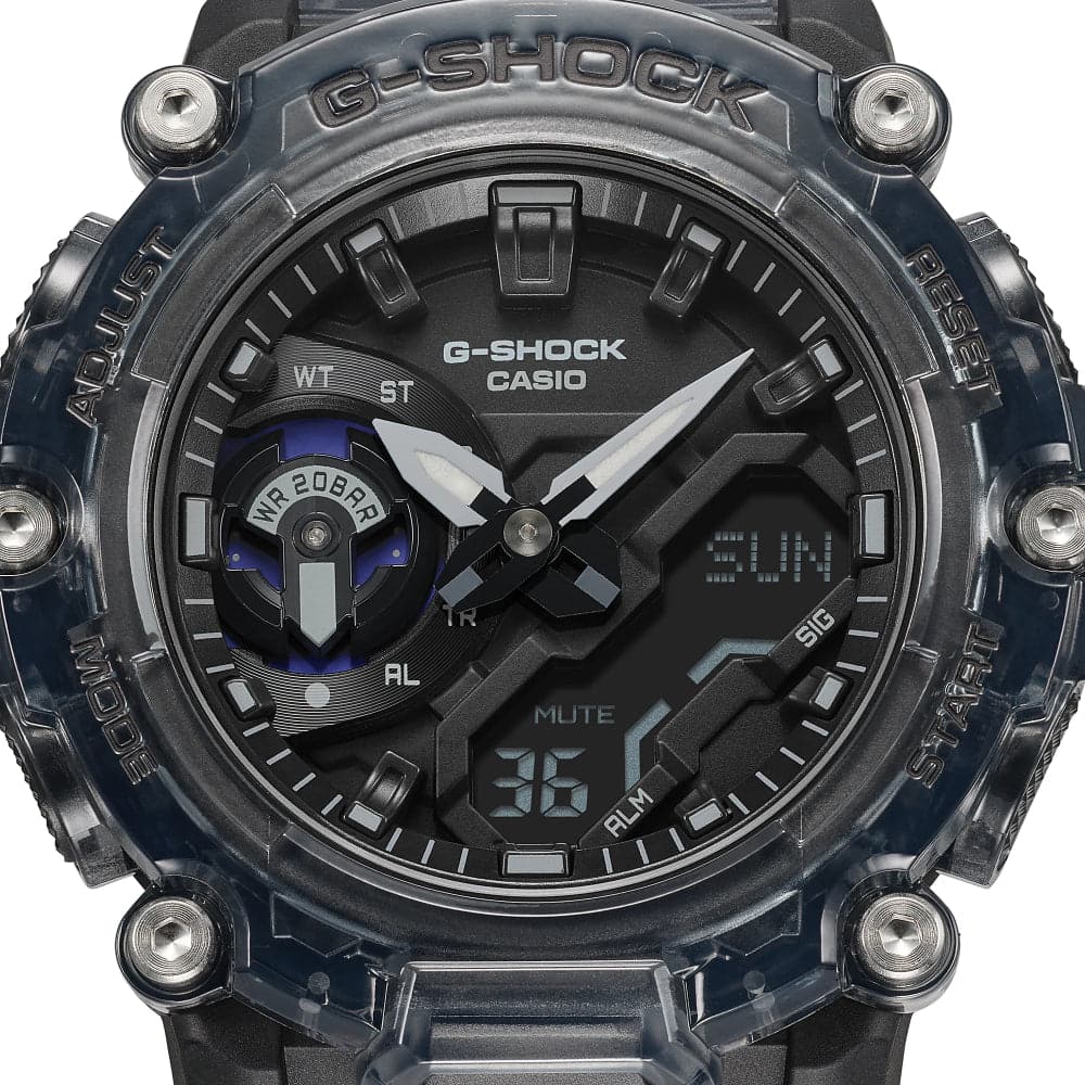 Plunge into the Sound Wave from G-SHOCK. Inspired by a surge of sound flowing over a dance floor, these watches translate this vision into color and design for a stereophonic take on the sporty GA-2200 featuring analog hands and digital display.