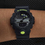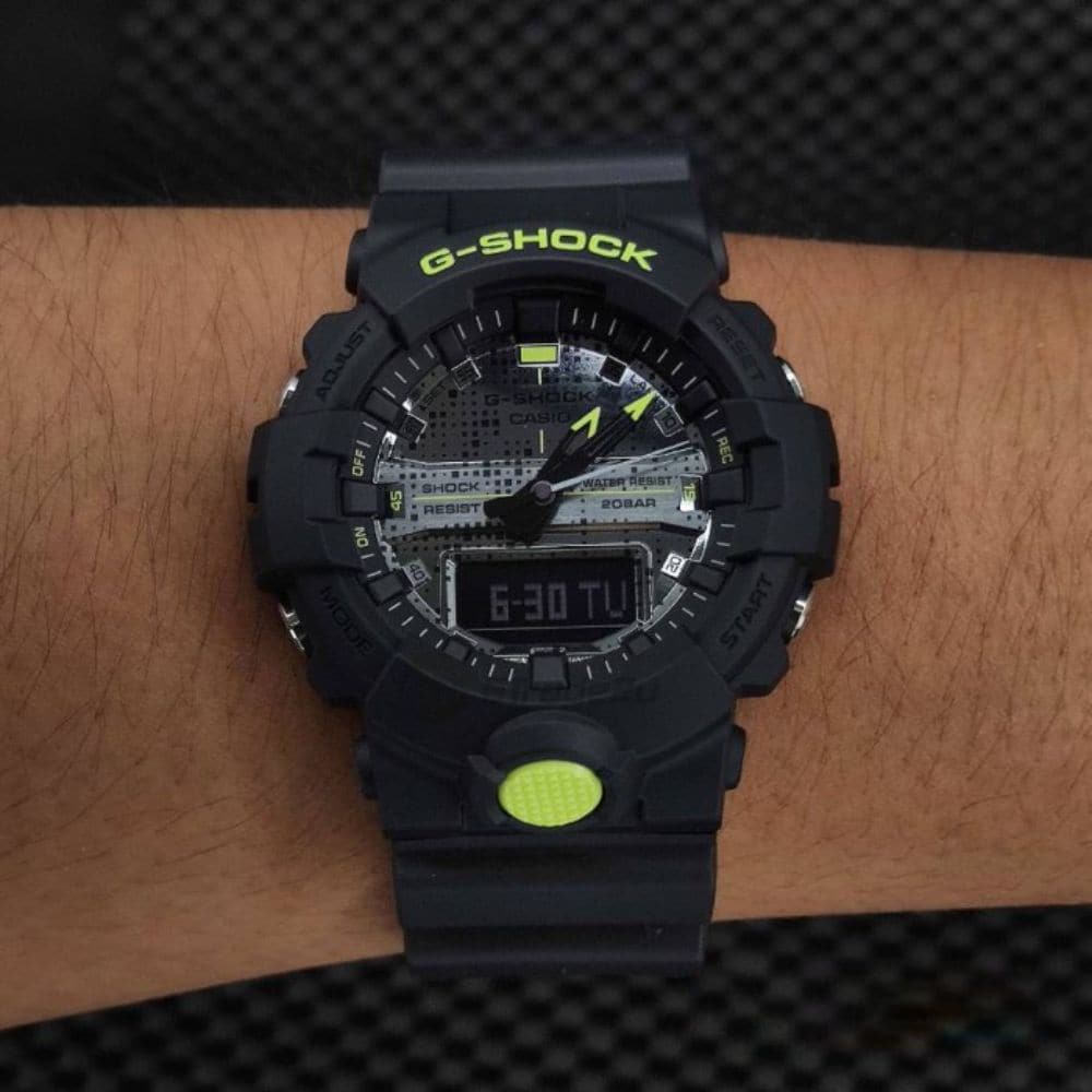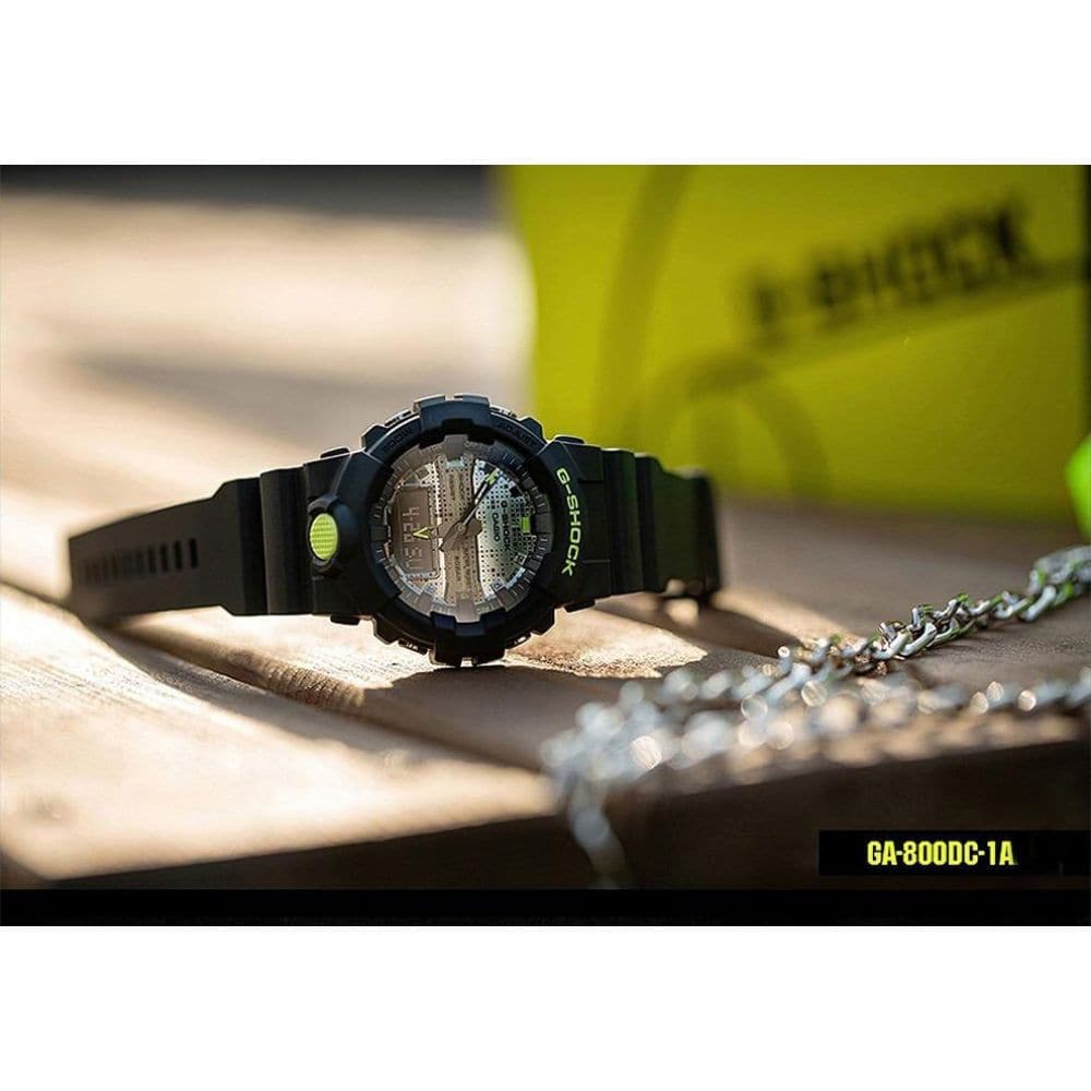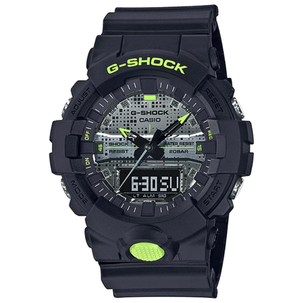 This new G-SHOCK model features digital camouflage pattern on metallic face that result in subdued designs. Base model is GA-800, the analog-digital timepieces. The basic black coloring of this model is offset by vivid yellow accents for a cool look.