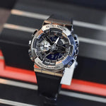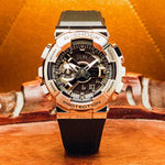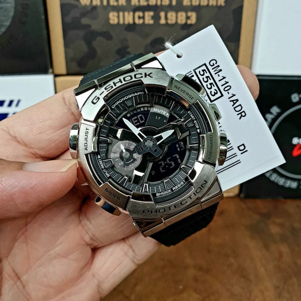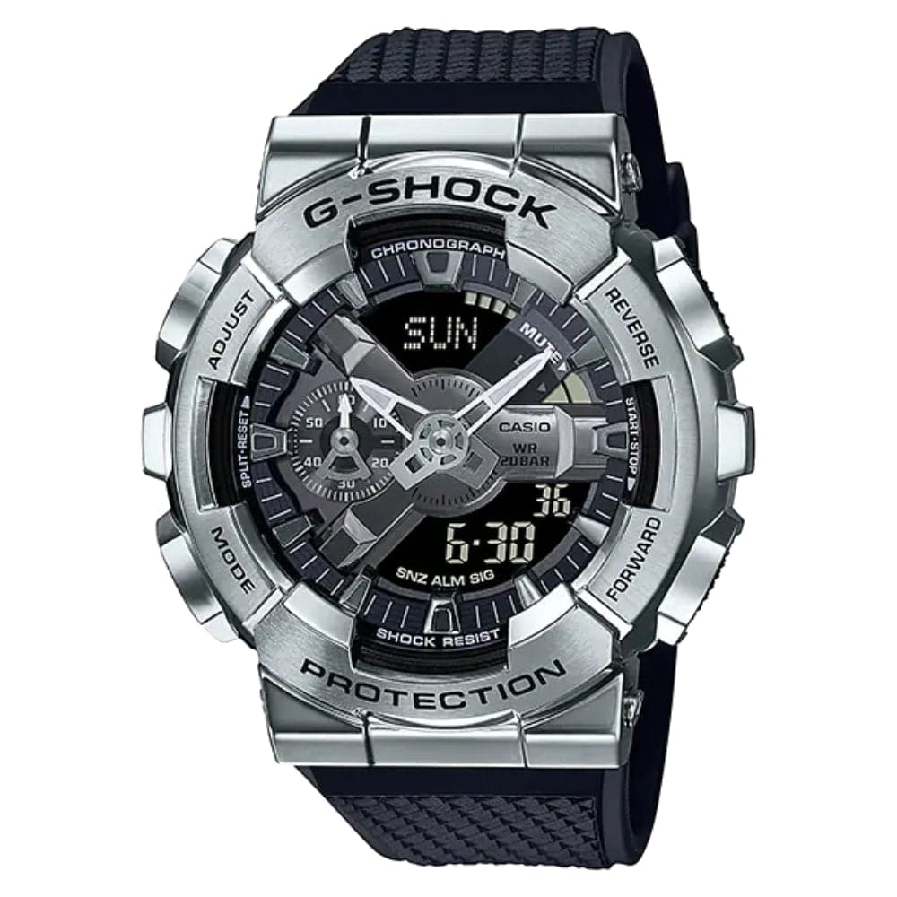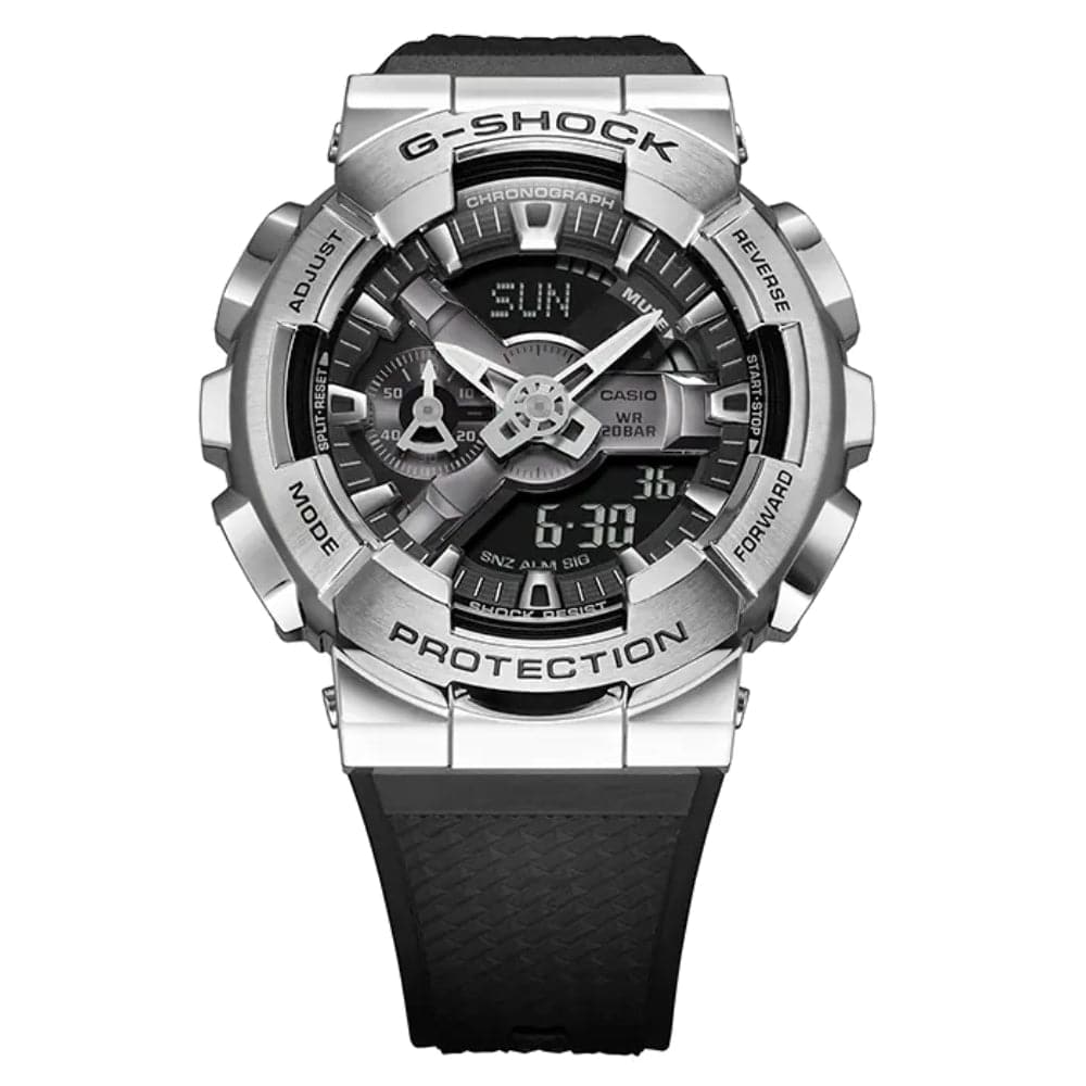 From G-SHOCK, the toughness watches that are ever evolving in an endless pursuit of strength, the GM-110 series is based on the digital-analog display combination GA-110 model of the rigid and fashionable Metal Covered line featuring stainless steel bezels. The dial has a characteristic Y-shaped part that retains the texture of the metal, and the digital display and hour and minute hands are arranged in a well balanced manner to improve visibility.