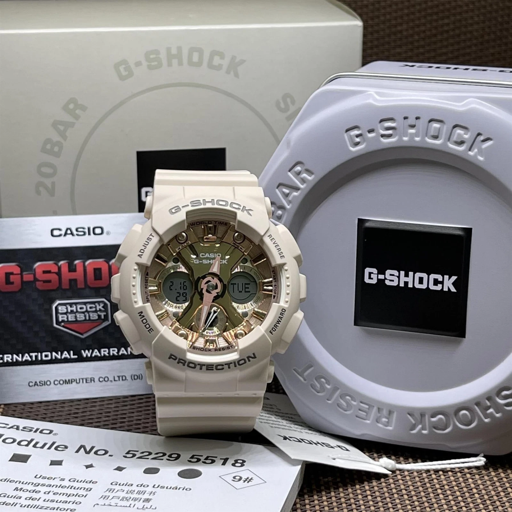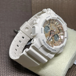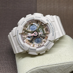 A model based on a mid-size version of the popular digital-analog combination GA-120 model. The metallic face is finished in pink gold and the bezel and band are finished in pink to create a casual, feminine model. A trendy smaller G-SHOCK perfect for youth culture.