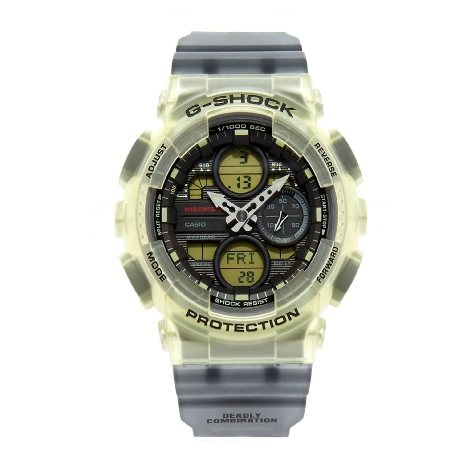 Introducing a new model created in collaboration with MISCHIEF, the Seoul street fashion brand that is highly popular in Korea and throughout the rest of Asia as well. This is a truly special collaboration model that combines a look inspired by the street fashion culture of the 90s that has become the signature style of the MISCHIEF brand, along with the form that created the G-SHOCK boom back in the 90s. The base model is the GMA-S140 dressed up in sun-washed themed vintage-like coloring. The MISCHIEF logo appears on the face, the back cover and band of this model. The band sports the phrase DEADLY COMBINATION, which celebrates the combination of the MISCHIEF and CASIO brands into powerful team that beats them all.