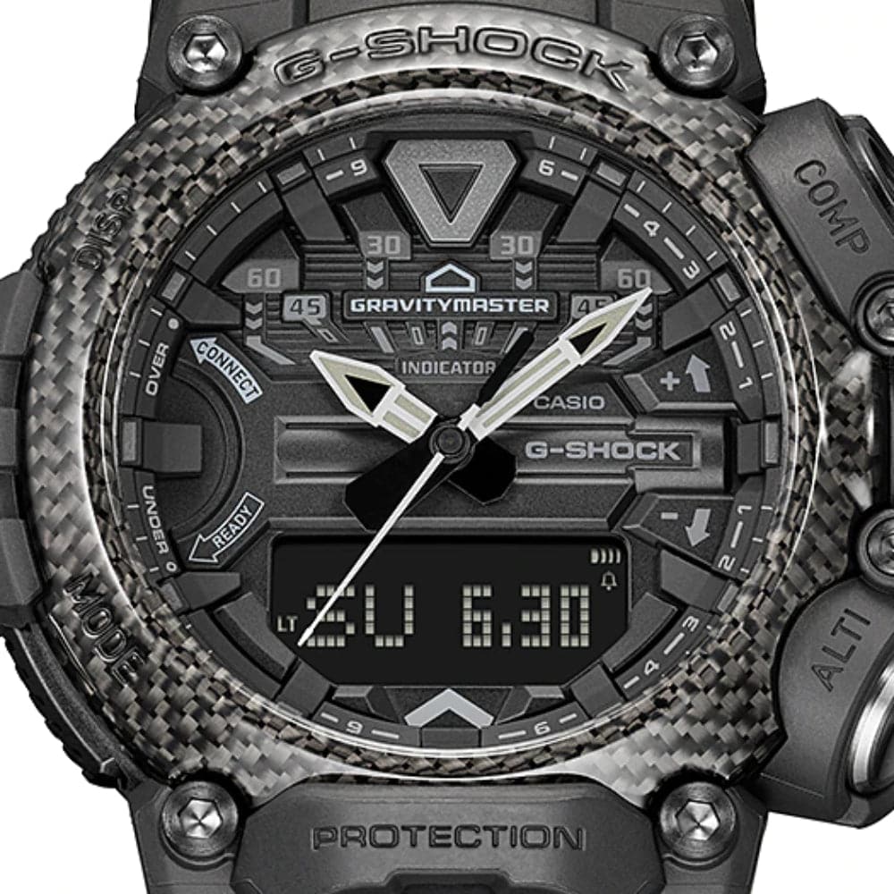 Designed for pros working in tough environments, MASTER of G specialty watches take advantage of carbon fiber’s exceptional strength-to-weight ratio to take timekeeping to entirely new heights. The bezel, made from carbon fiber inserts pressed between layers of resin, delivers outstanding toughness and practicality. And you can count on the exceptional functionality everyone expects from a G-SHOCK watch.