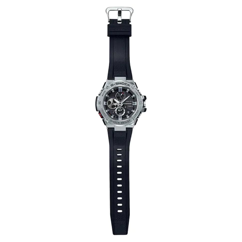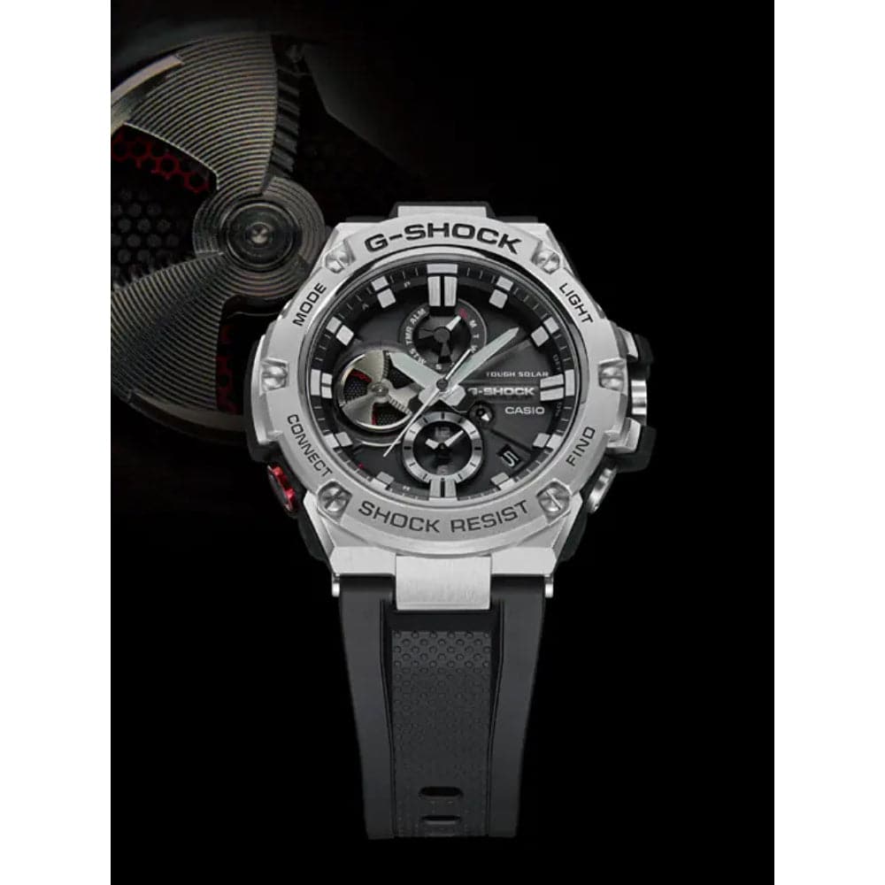 A G-STEEL model featuring a solid case, a chronograph with an analog display, and a urethane band designed with a motif of heavy jet engine blades. A dual-coil motor in a rotating disc dial placed at 9 o'clock moves the dial blades and exudes a functional beauty. In addition to the alarm on/off function and using the rotation to show the stopwatch, etc., it also functions as a battery indicator, contributing to a tough chronograph. The layer guard structure and high-density mounting technology have allowed the module to be smaller and thinner, improving we arability and overall watch quality. It is also equipped with Bluetooth® connectivity that enables accurate time acquisition via your smartphone. Its Tough Solar feature allows it to run stably, and it is also equipped with practical functions such as high-brightness LEDs and dual-dial world time.